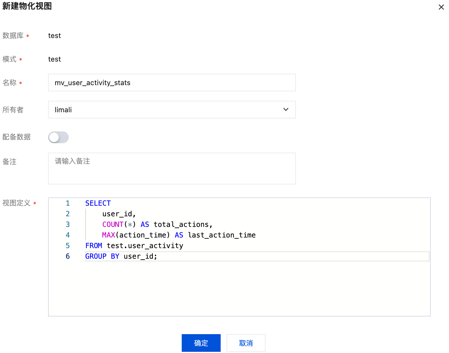 2. 在弹出的对话框中,配置物化视图参数,单击确定。