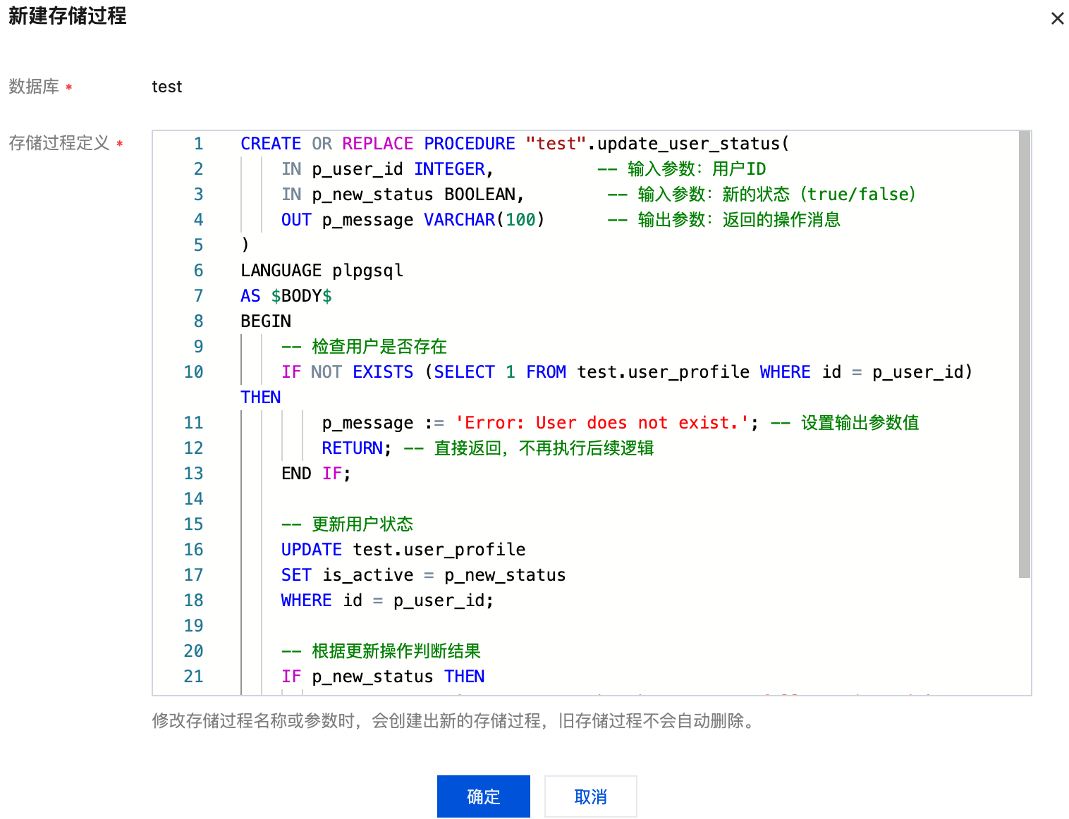 2. 在弹出的对话框中,定义存储过程,单击确定。