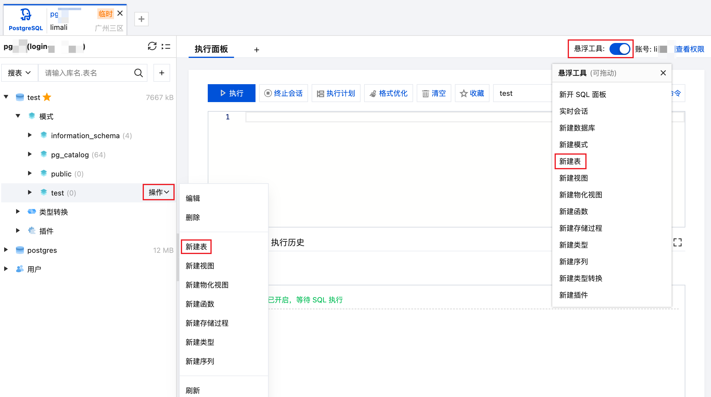 1. 在左侧库表栏,鼠标悬停至模式名称处,选择操作 > 新建表,或在页面右上方单击打开悬浮工具,选择新建表。