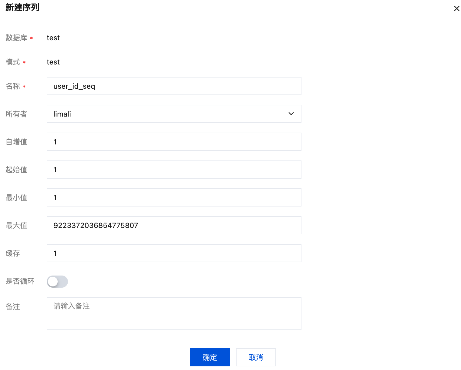 备注 | 否 | 填写对该序列的用途描述(如“用户表主键序列”)。 |