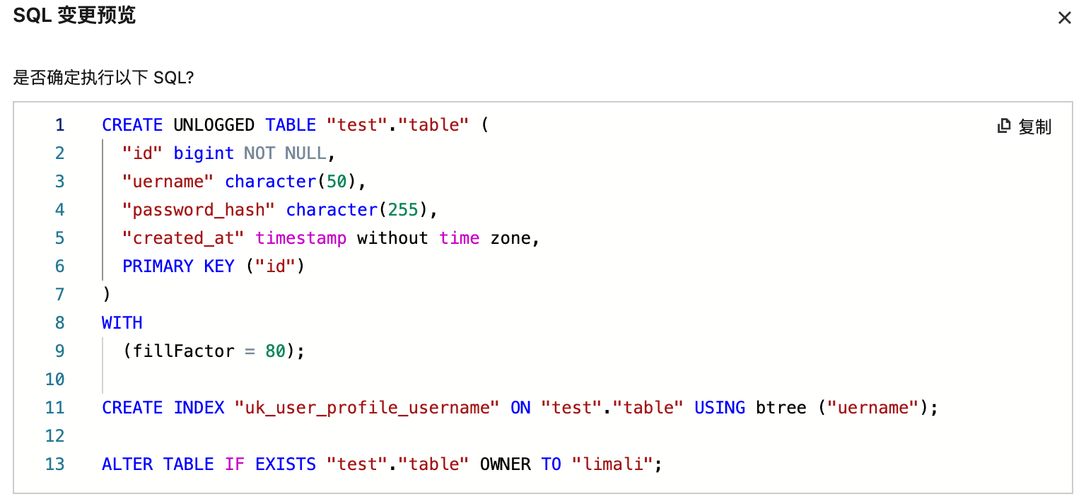 在左侧库表栏,鼠标悬停至表名称处,选择操作 > 编辑表结构,可编辑表的基本信息、列信息、索引、唯一约束、外键约束、检查约束和排除约束,并支持对 SQL 变更进行预览。