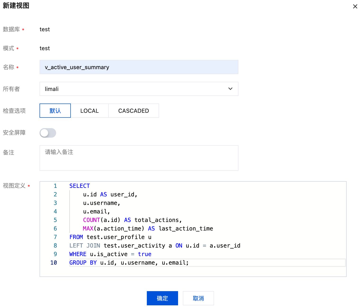 安全屏障 | 否 | 建议谨慎开启。此选项会强制在应用任何用户条件之前先执行视图的 WHERE 条件,可用于防止“特洛伊木马”式的查询条件攻击,但可能会影响查询优化和性能。对于简单视图通常无需开启。 |