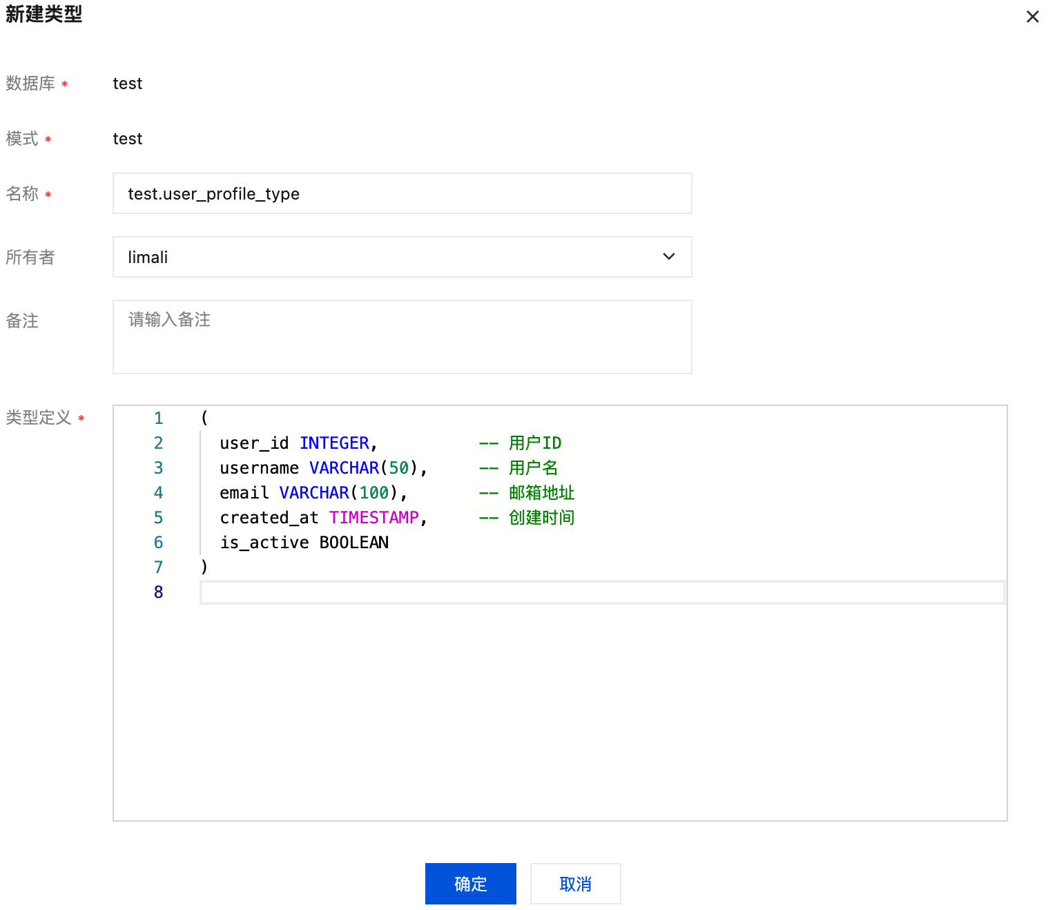 备注 | 否 | 填写对该表的用途、功能的描述性文字,便于后续维护(如“用户基础信息表”)。 |