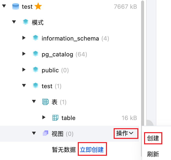 同时支持在左侧库表栏,鼠标悬停至视图目录处,选择操作 > 创建。