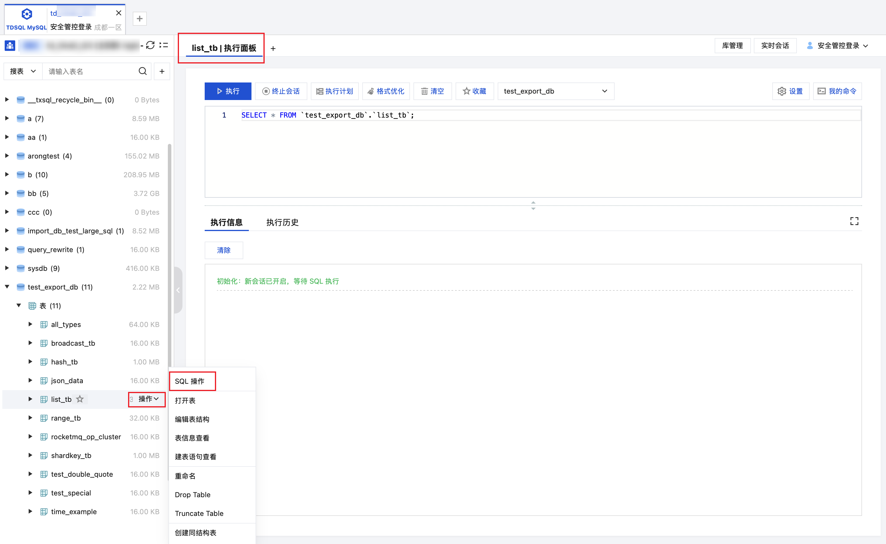 鼠标悬停至表名称处,选择操作 > SQL 操作,进入该表对应的执行面板。