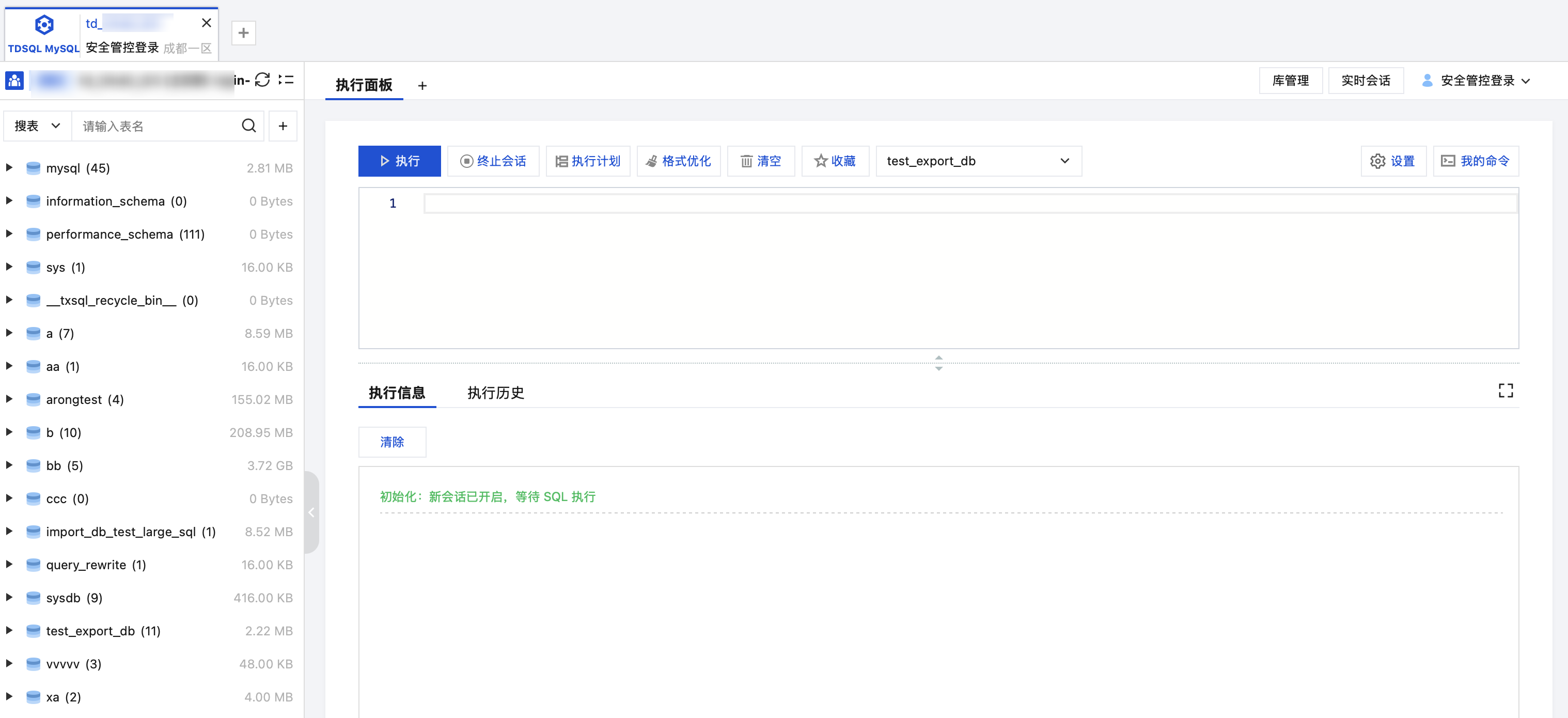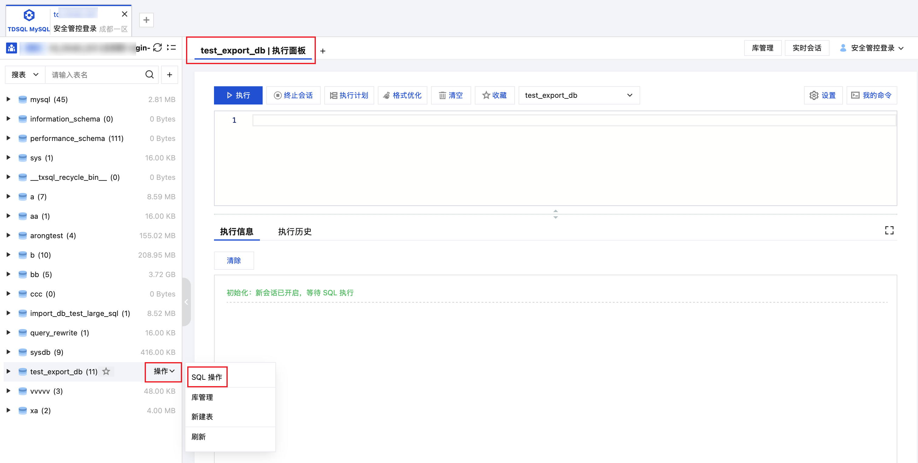鼠标悬停至数据库名称处,选择操作 > SQL 操作,进入该数据库对应的执行面板。