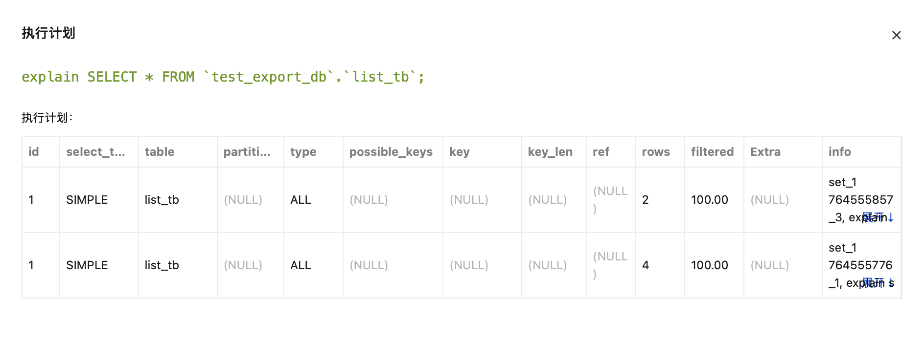 查看 SQL 执行计划:在页面上方单击执行计划。