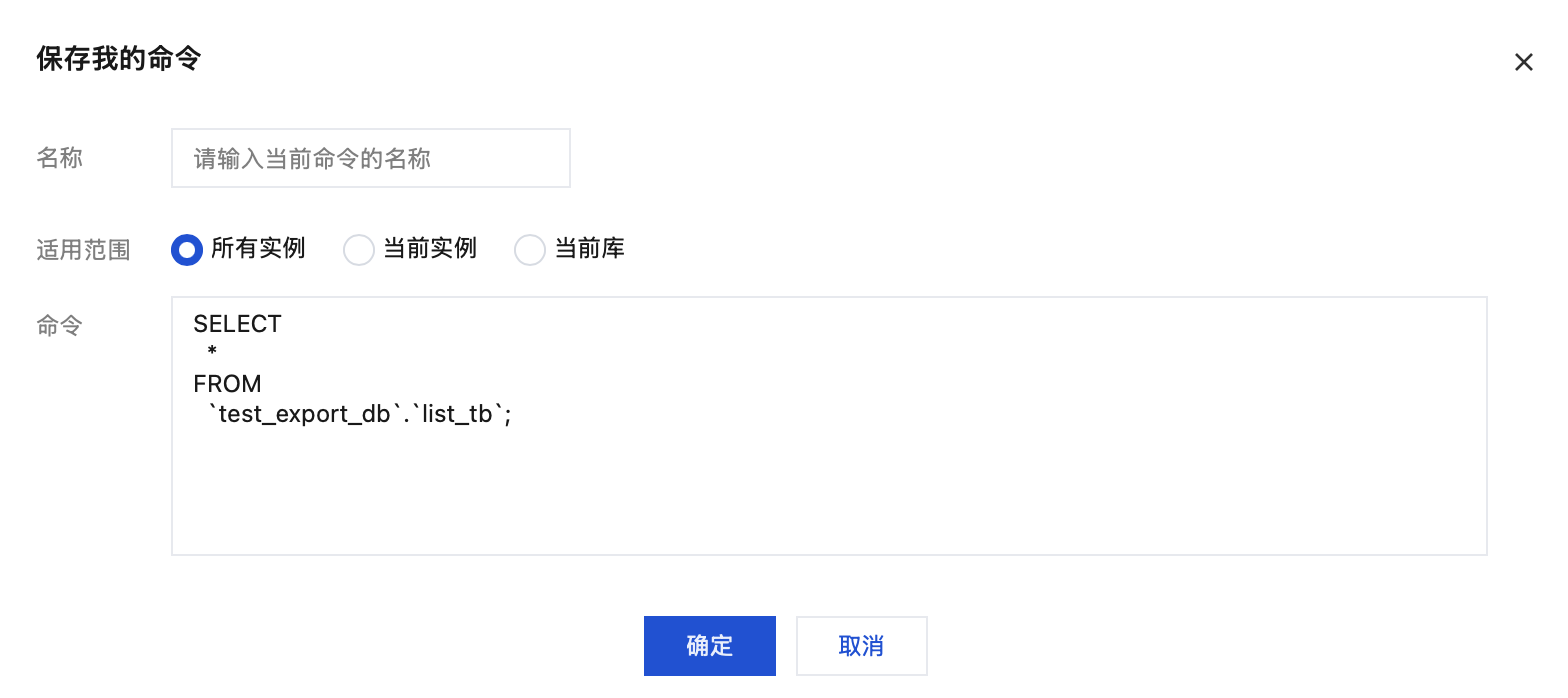 保存命令:在页面上方单击收藏,在弹出的页面中,输入名称、选择适用范围,单击确定。