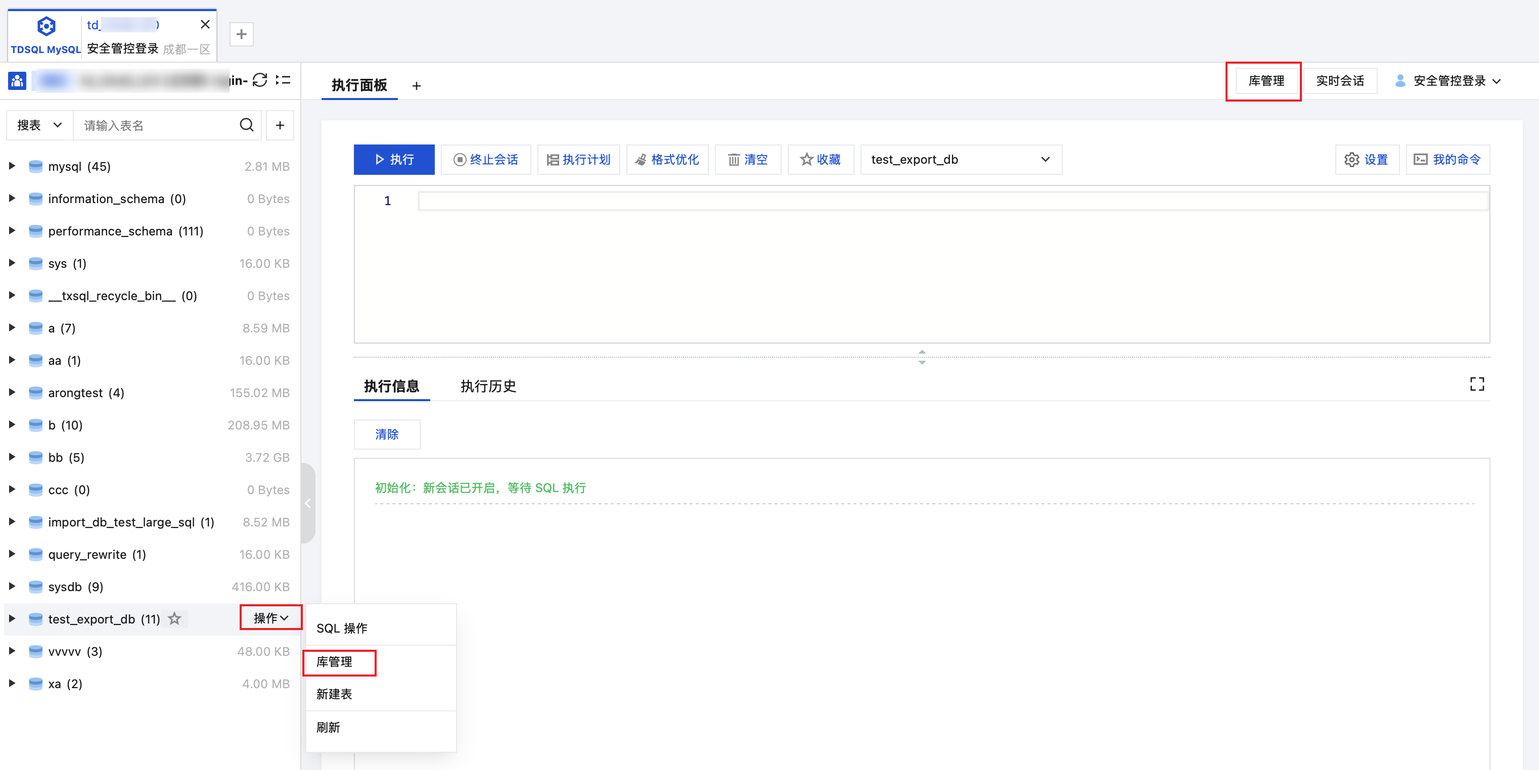 1. 在左侧库表栏,鼠标悬停至数据库名称处,选择操作 > 库管理。