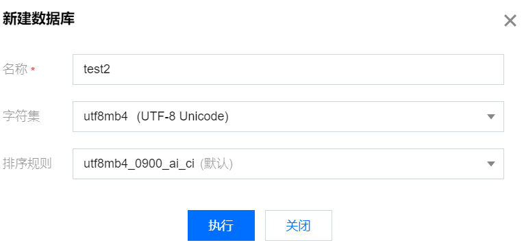 3. 在弹出的对话框中输入数据库名称,选择字符集和排序规则,单击执行。