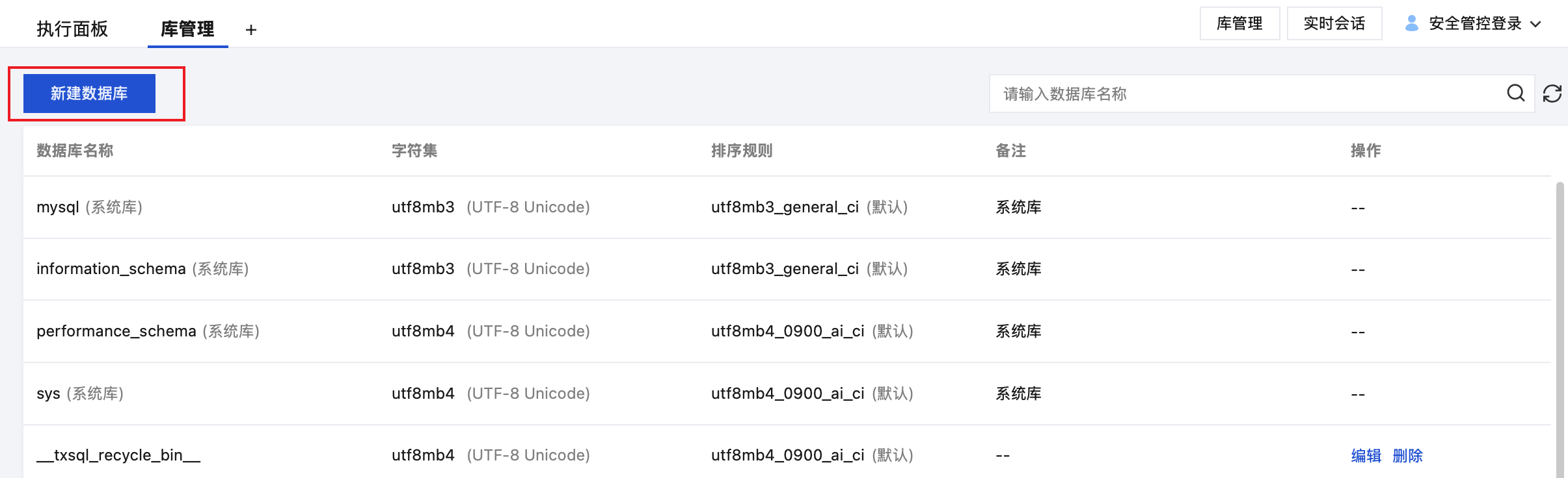 2. 在库管理页面对应的操作列单击编辑,修改字符集和排序规则,修改完成后,单击执行。