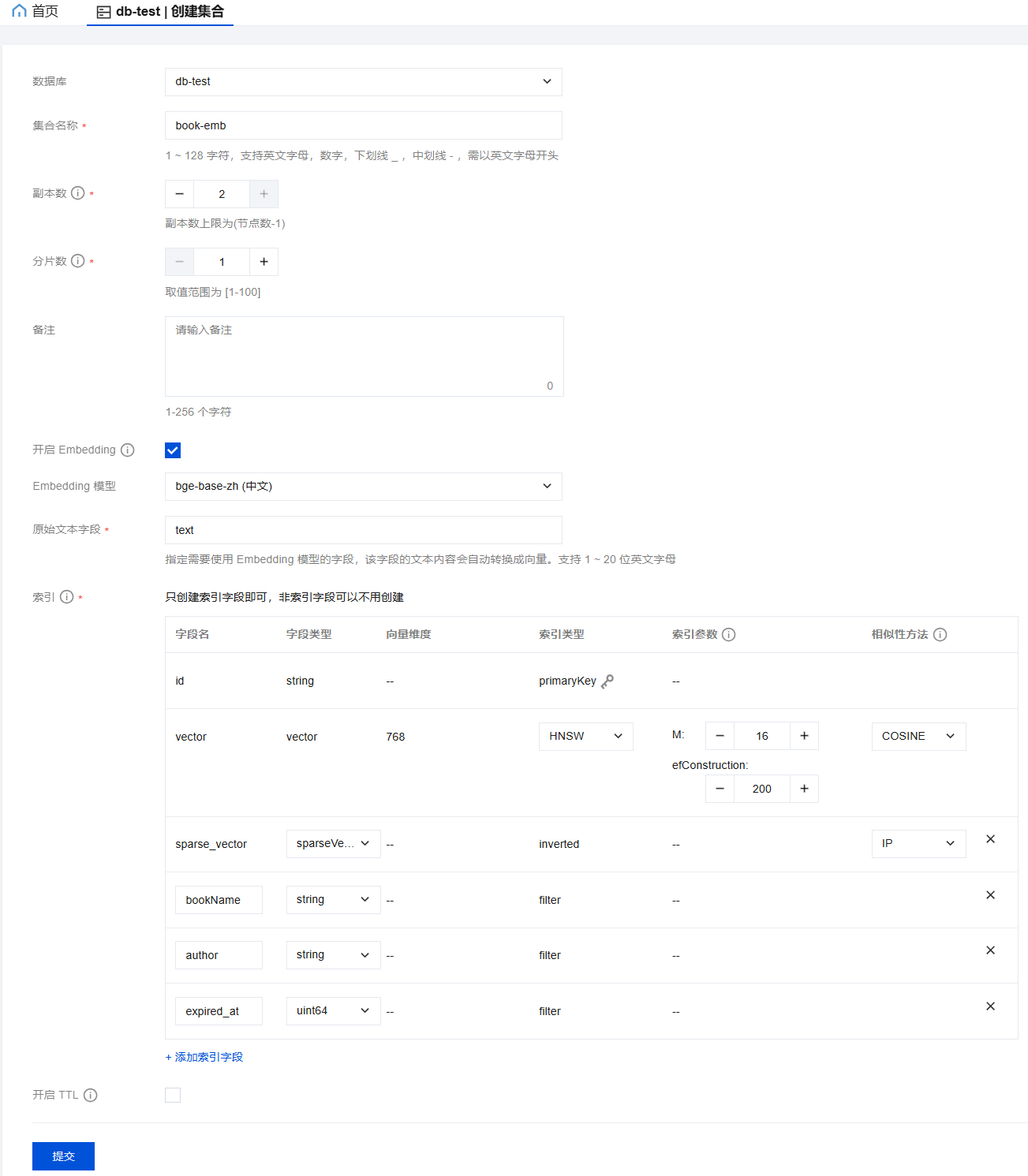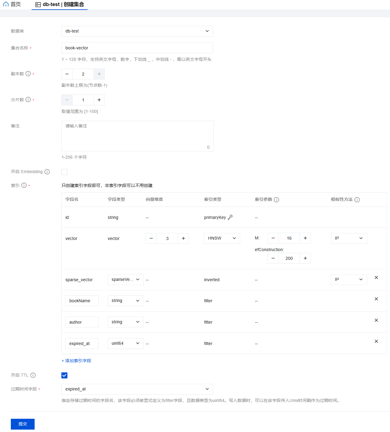 | 字段名 | 主键索引:该参数固定为  id。向量索引:该参数固定为 vector。稀疏向量索引:单击添加索引字段,新增稀疏向量索引,该参数固定为 sparse_vector。Filter 索引:单击添加索引字段,可添加一个或多个 Filter 索引,可设置字段名和字段类型。 |