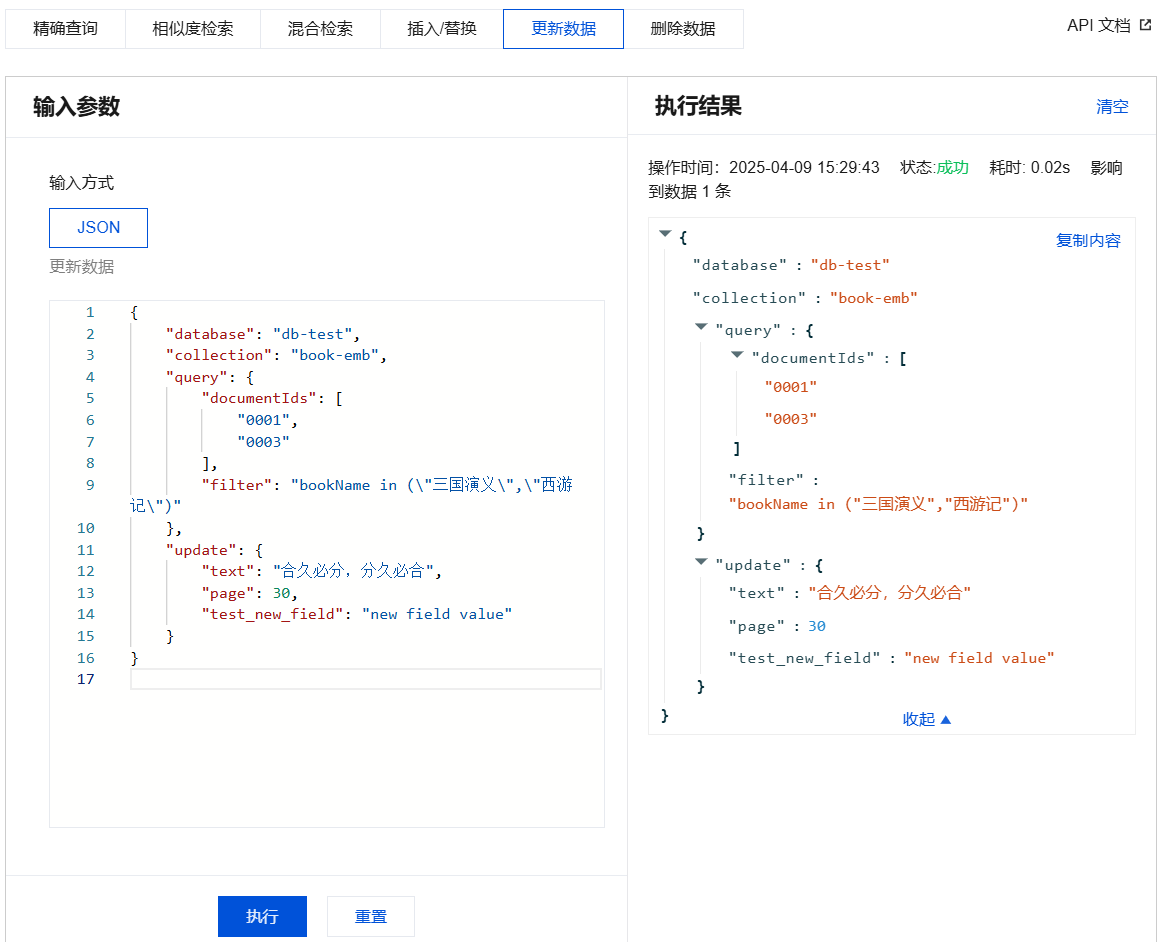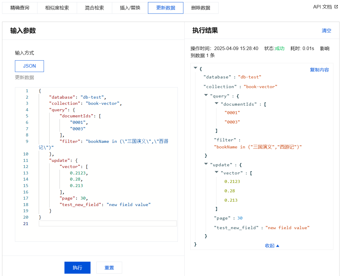 {"database": "db-test","collection": "book-vector","query": {"documentIds": ["0001","0003"],"filter": "bookName in (\\"三国演义\\",\\"西游记\\")"},"update": {"vector": [0.2123,0.28,0.213],"page": 30,"test_new_field": "new field value"}}