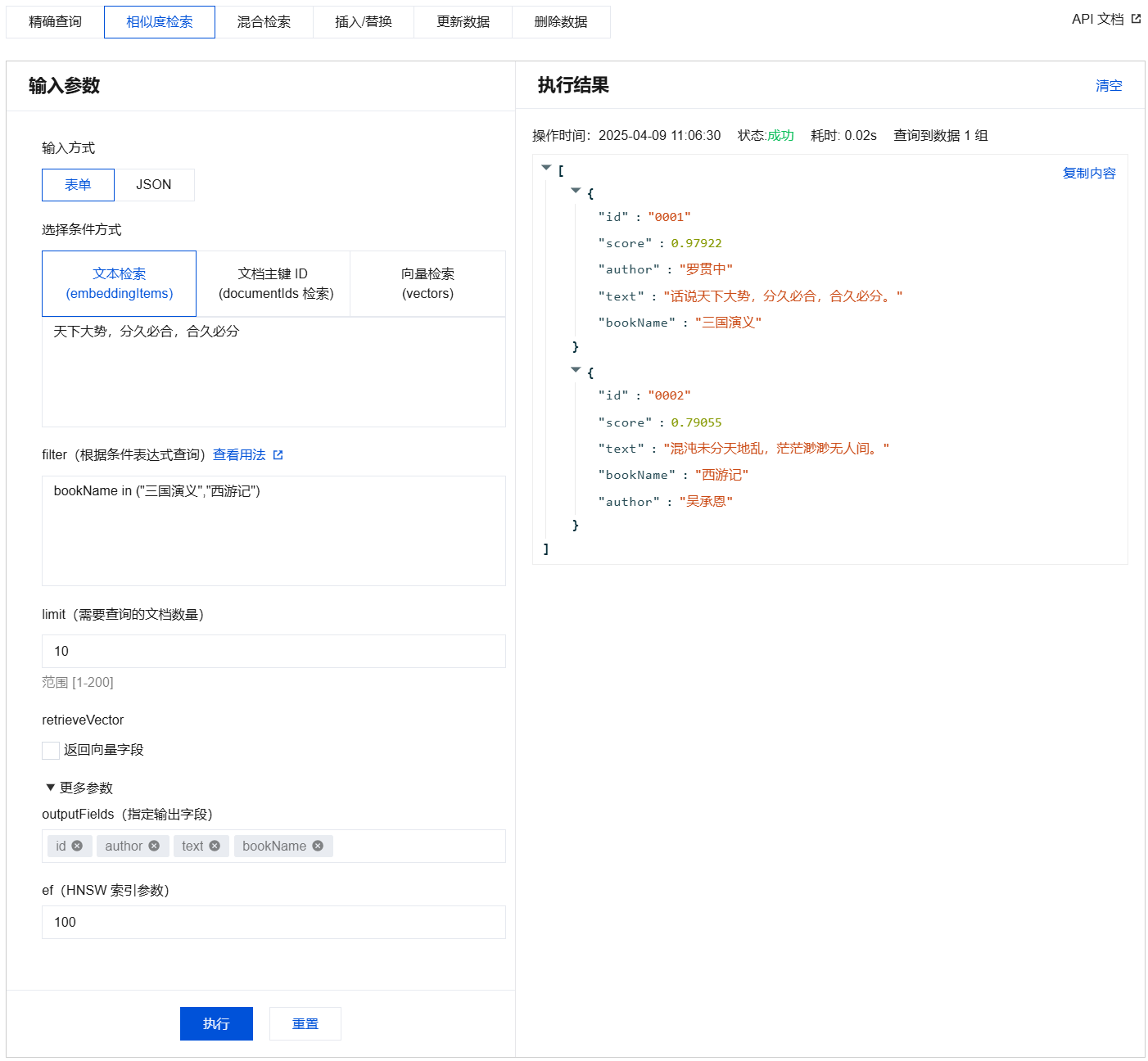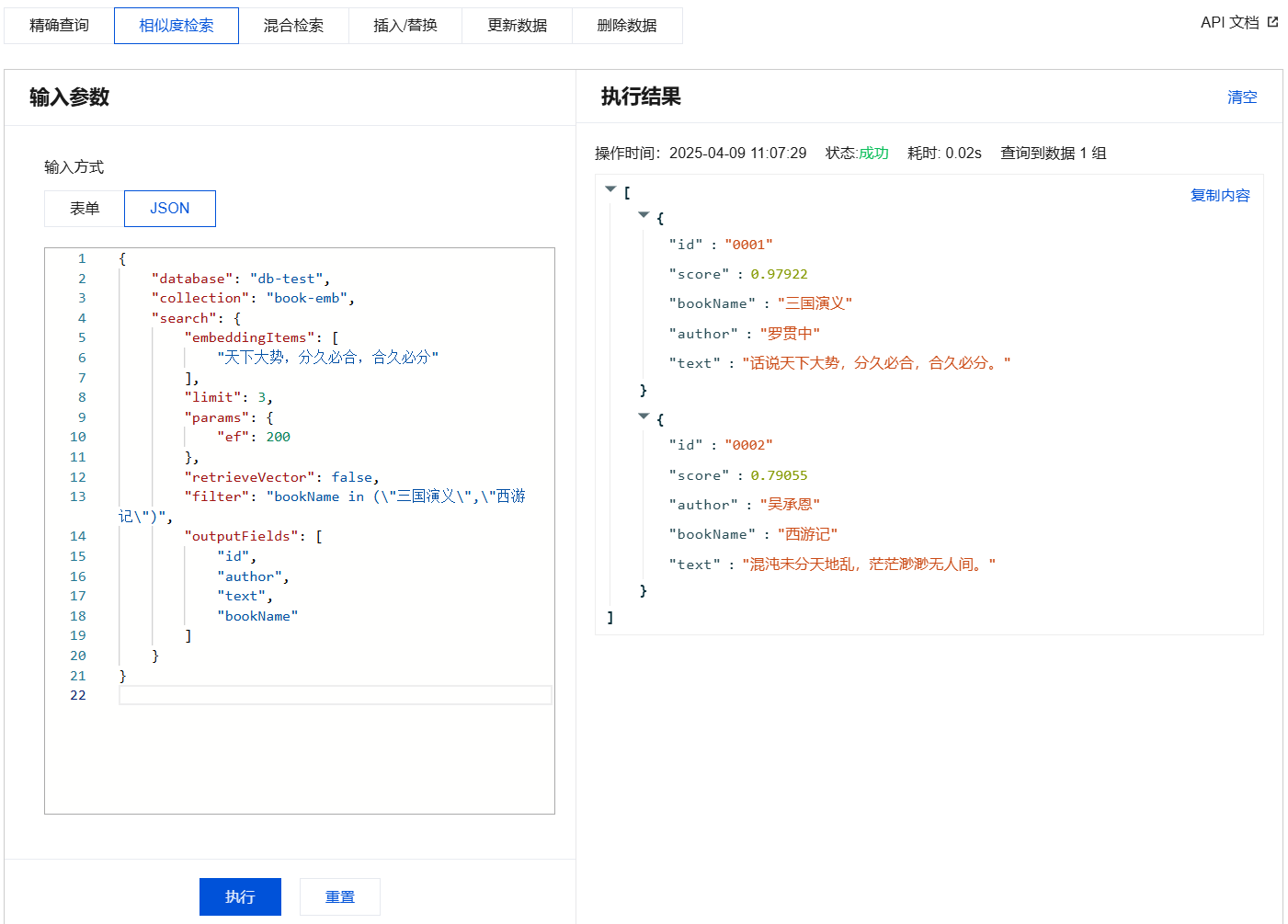 {"database": "db-test","collection": "book-emb","search": {"embeddingItems": ["天下大势,分久必合,合久必分"],"limit": 3,"params": {"ef": 200},"retrieveVector": false,"filter": "bookName in (\\"三国演义\\",\\"西游记\\")","outputFields": ["id","author","text","bookName"]}}