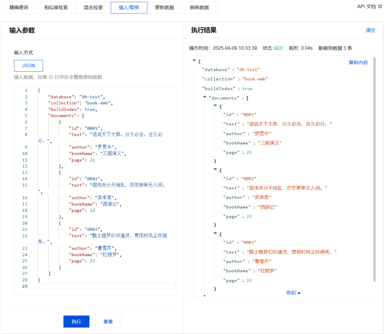 {"database": "db-test","collection": "book-emb","buildIndex": true,"documents": [{"id": "0001","text": "话说天下大势,分久必合,合久必分。","author": "罗贯中","bookName": "三国演义","page": 21},{"id": "0002","text": "混沌未分天地乱,茫茫渺渺无人间。","author": "吴承恩","bookName": "西游记","page": 22},{"id": "0003","text": "甄士隐梦幻识通灵,贾雨村风尘怀闺秀。","author": "曹雪芹","bookName": "红楼梦","page": 23}]}
