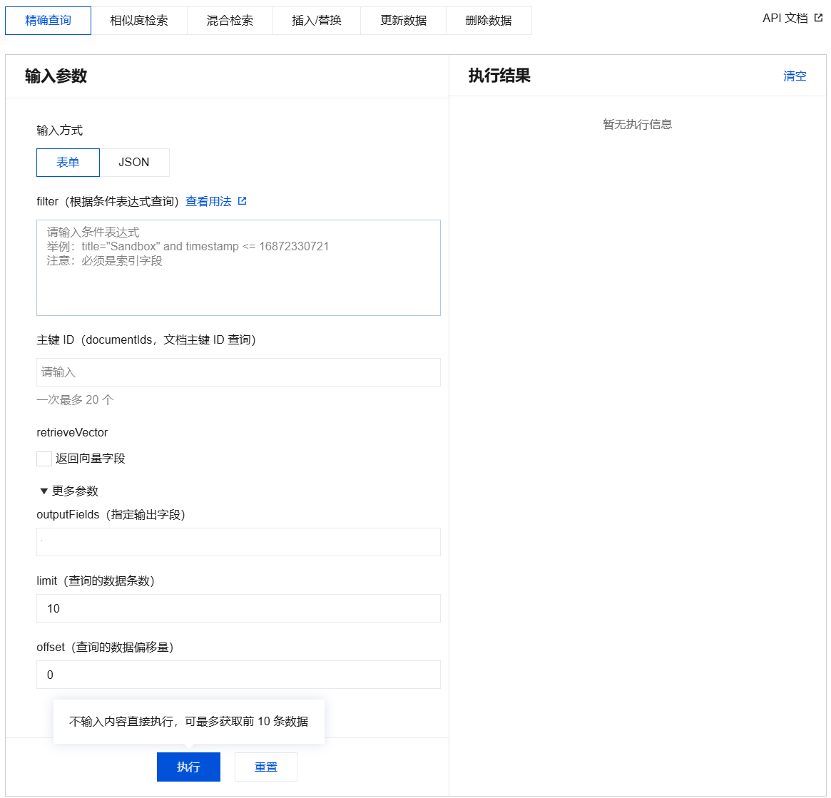 当输入方式选择表单,不输入任何参数,单击执行,可最多获取该集合内的前10条数据。