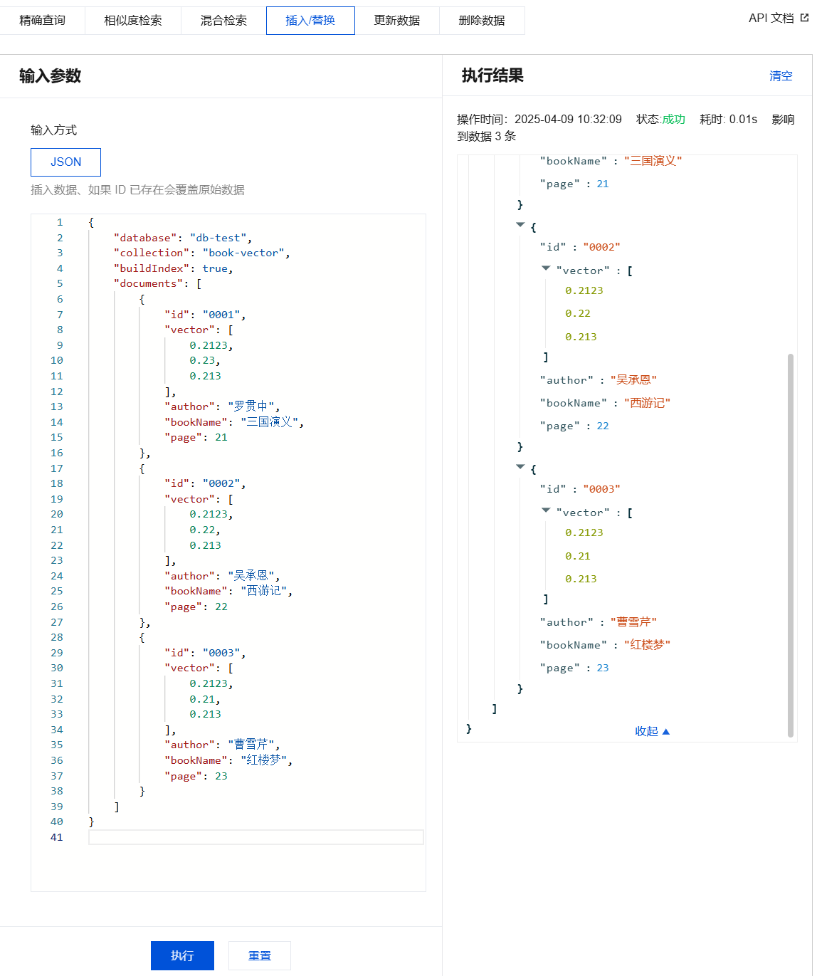 {"database": "db-test","collection": "book-vector","buildIndex": true,"documents": [{"id": "0001","vector": [0.2123,0.23,0.213],"author": "罗贯中","bookName": "三国演义","page": 21},{"id": "0002","vector": [0.2123,0.22,0.213],"author": "吴承恩","bookName": "西游记","page": 22},{"id": "0003","vector": [0.2123,0.21,0.213],"author": "曹雪芹","bookName": "红楼梦","page": 23}]}