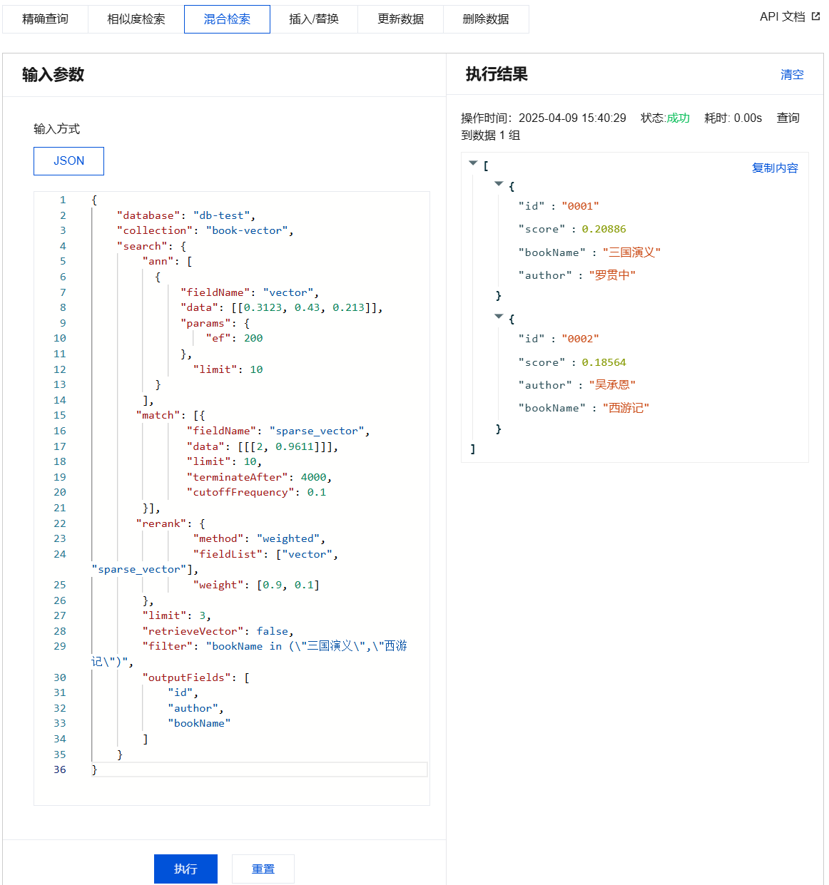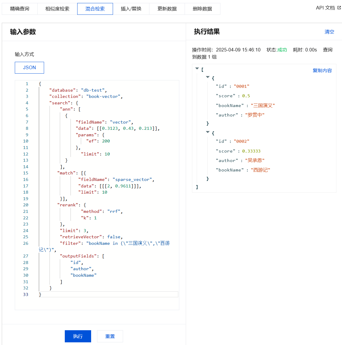 {"database": "db-test","collection": "book-vector","search": {"ann": [{"fieldName": "vector","data": [[0.3123, 0.43, 0.213]],"params": {"ef": 200},"limit": 10}],"match": [{"fieldName": "sparse_vector","data": [[[2, 0.9611]]],"limit": 10}],"rerank": {"method": "rrf","k": 1},"limit": 3,"retrieveVector": false,"filter": "bookName in (\\"三国演义\\",\\"西游记\\")","outputFields": ["id","author","bookName"]}}