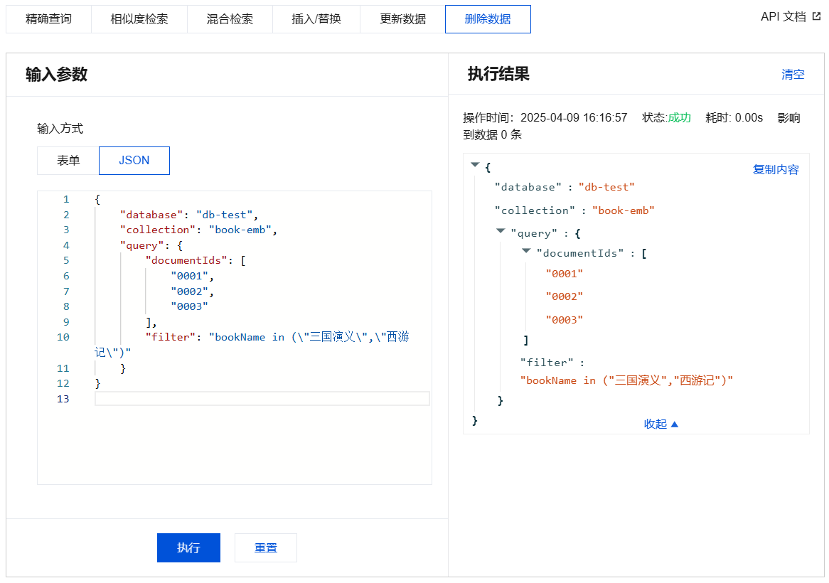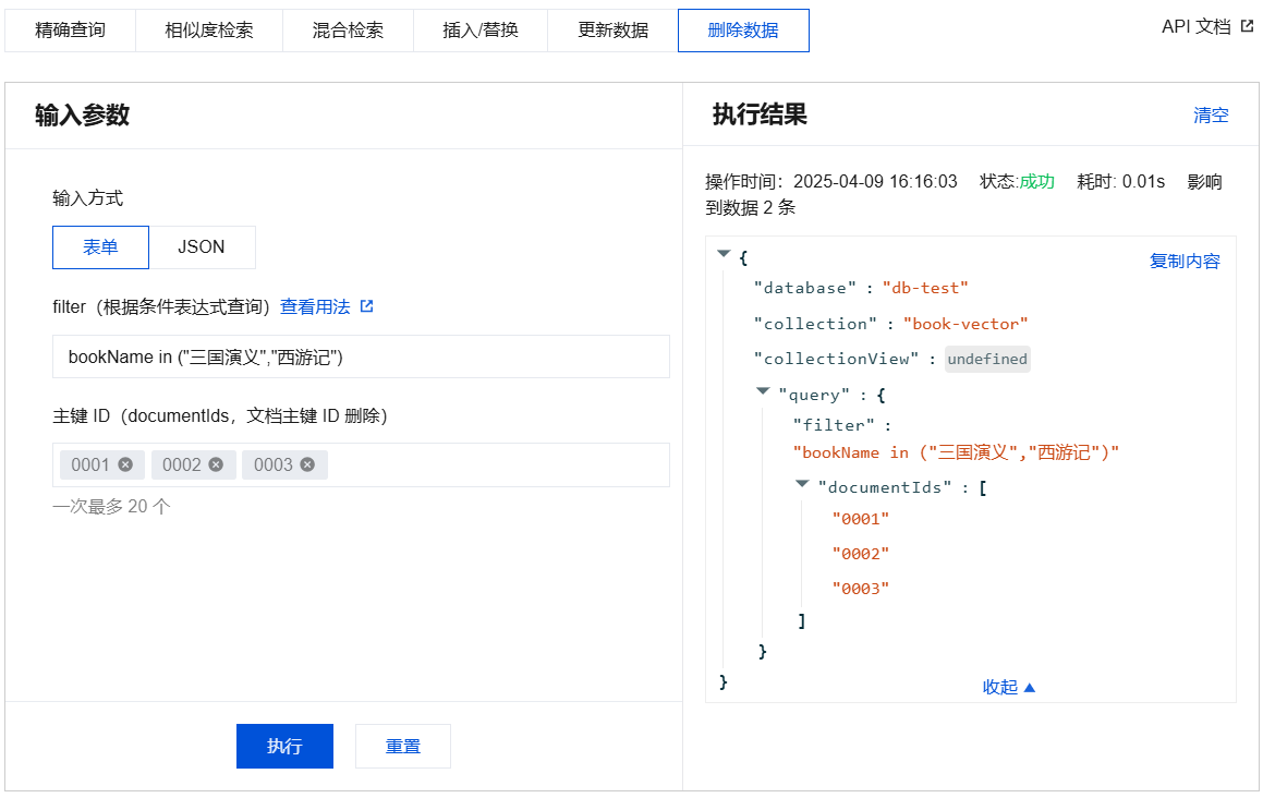 用于删除指定 id(Document ID)的文档,且支持设置 Filter 表达式,删除满足 Filter 表达式的数据。