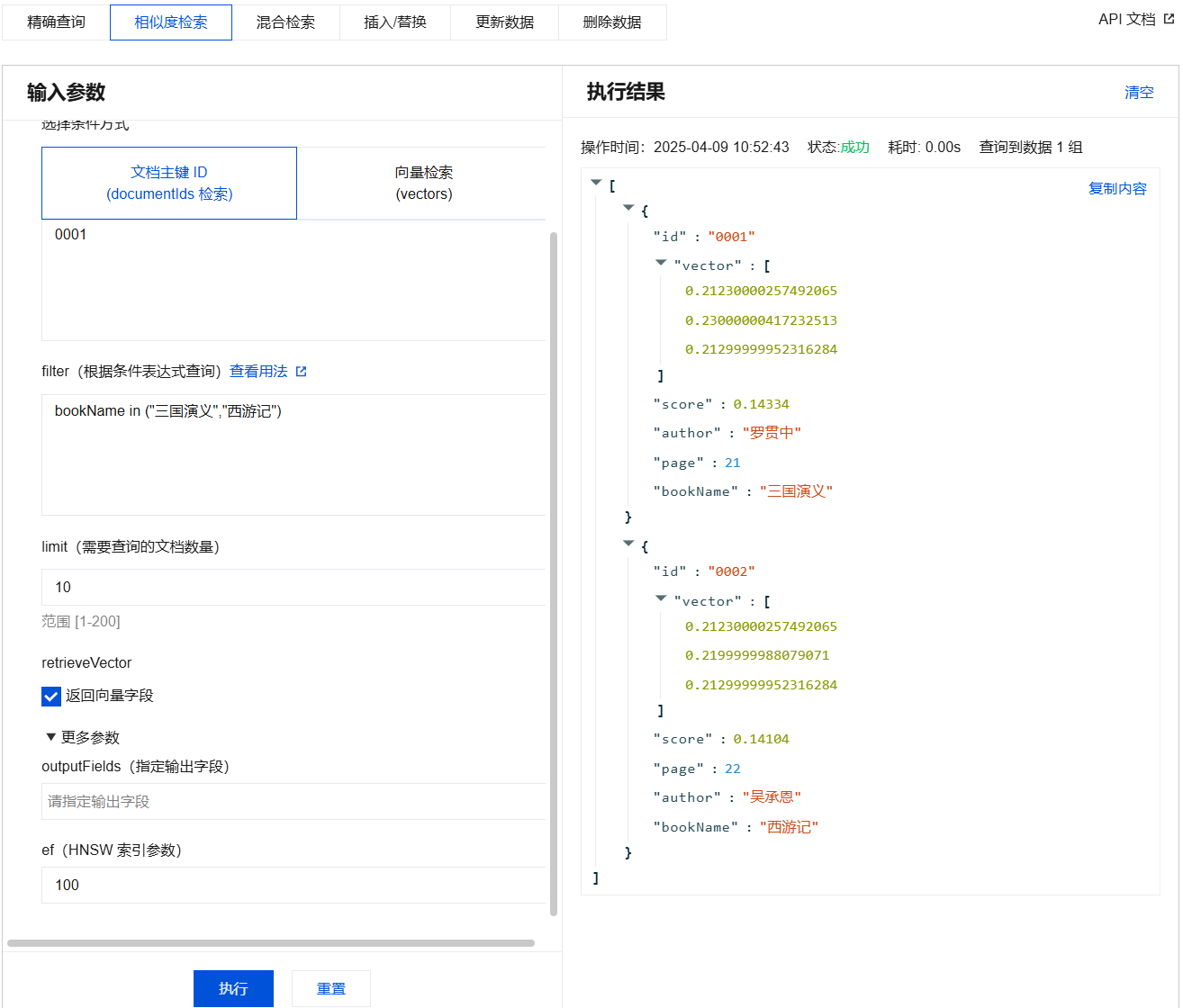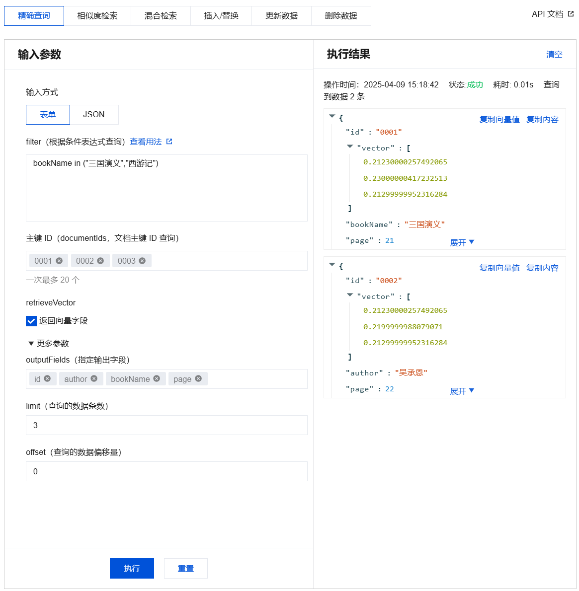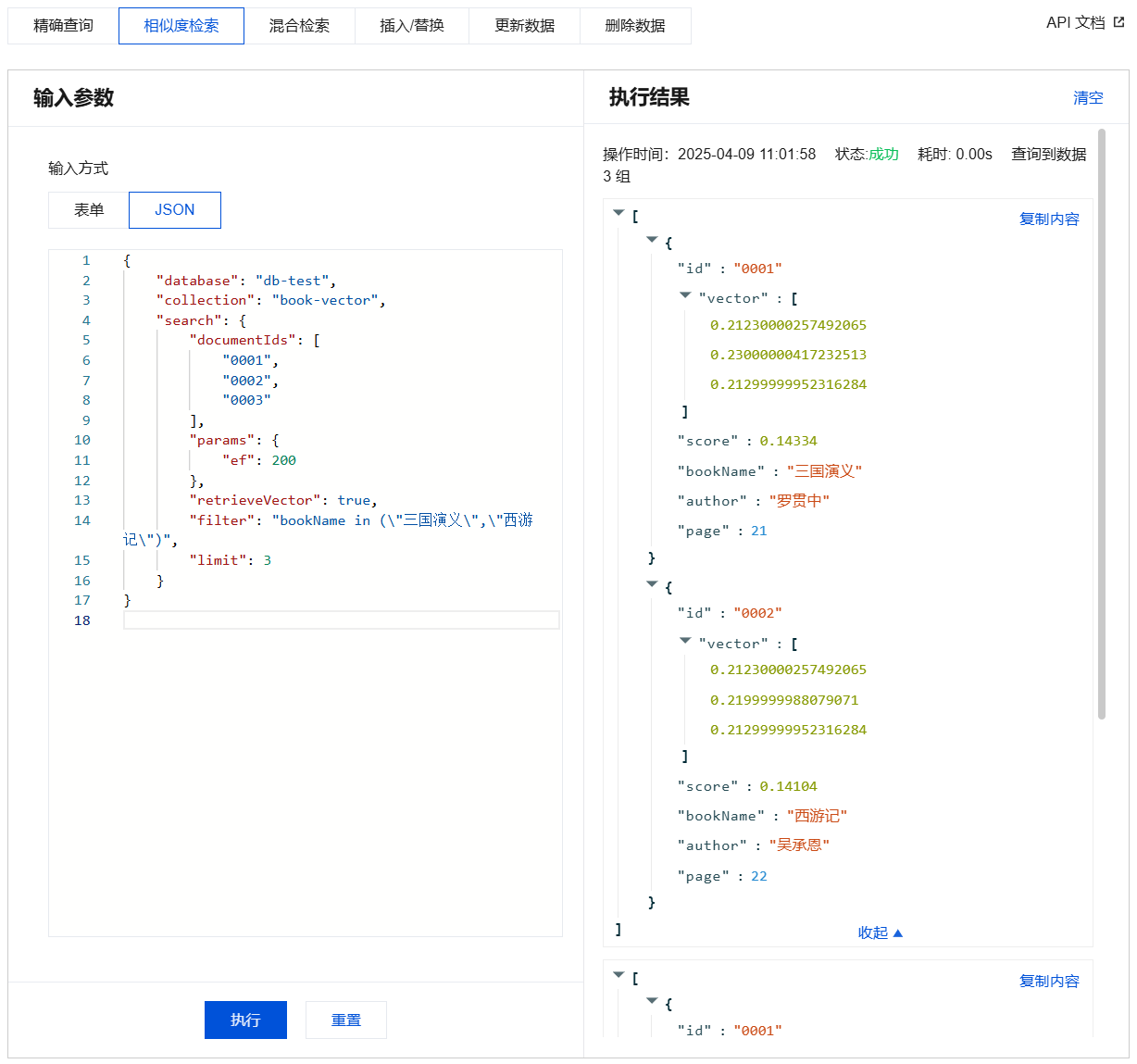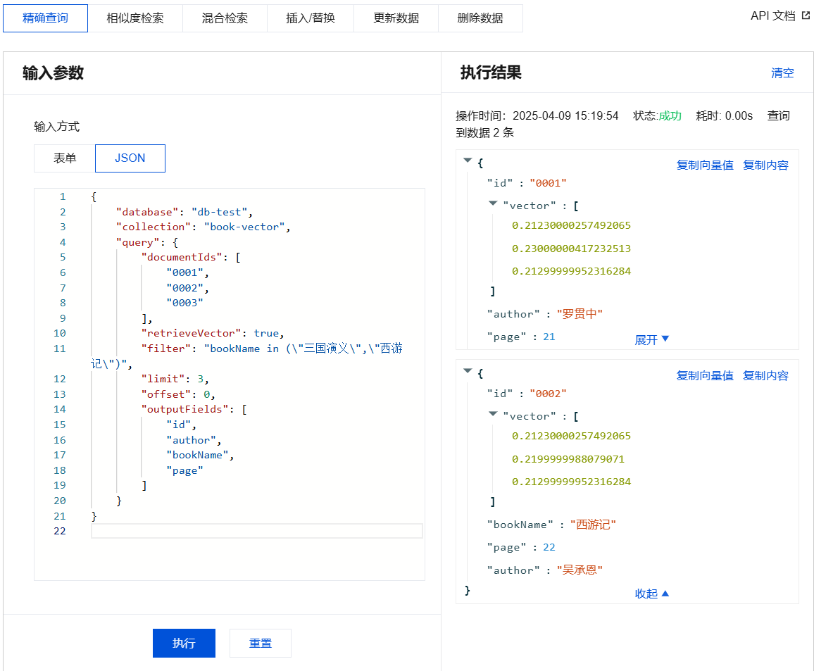 {"database": "db-test","collection": "book-vector","query": {"documentIds": ["0001","0002","0003"],"retrieveVector": true,"filter": "bookName in (\\"三国演义\\",\\"西游记\\")","limit": 3,"offset": 0,"outputFields": ["id","author","bookName","page"]}}