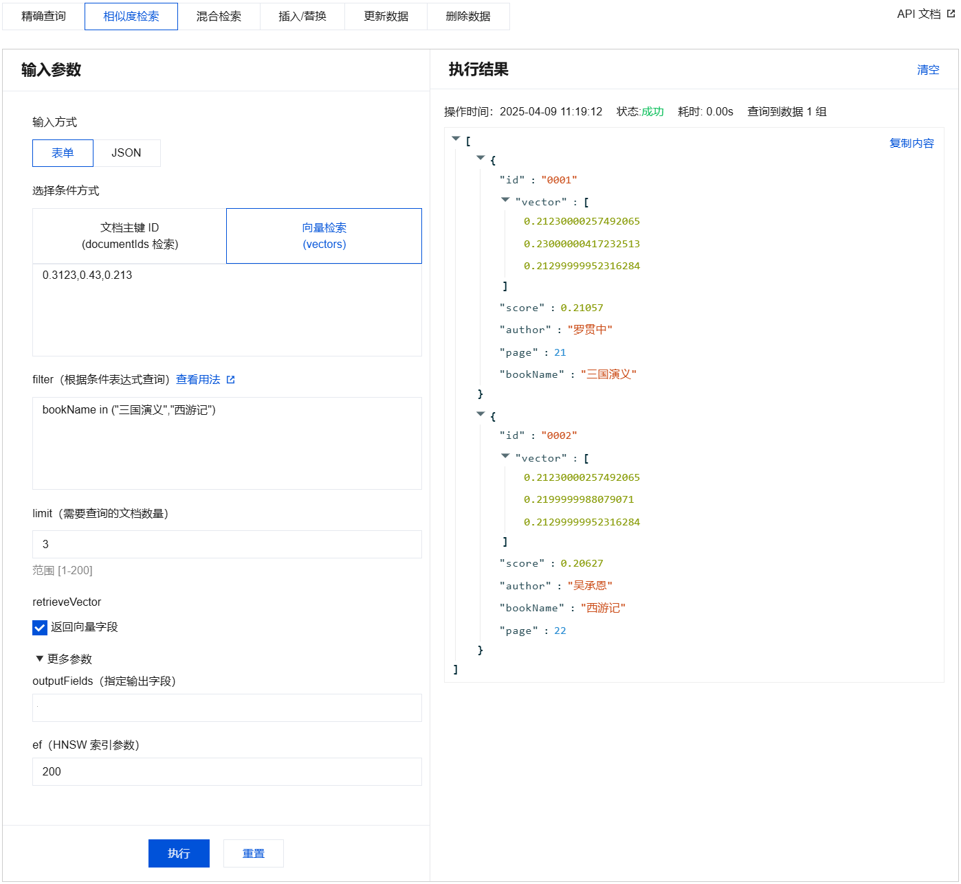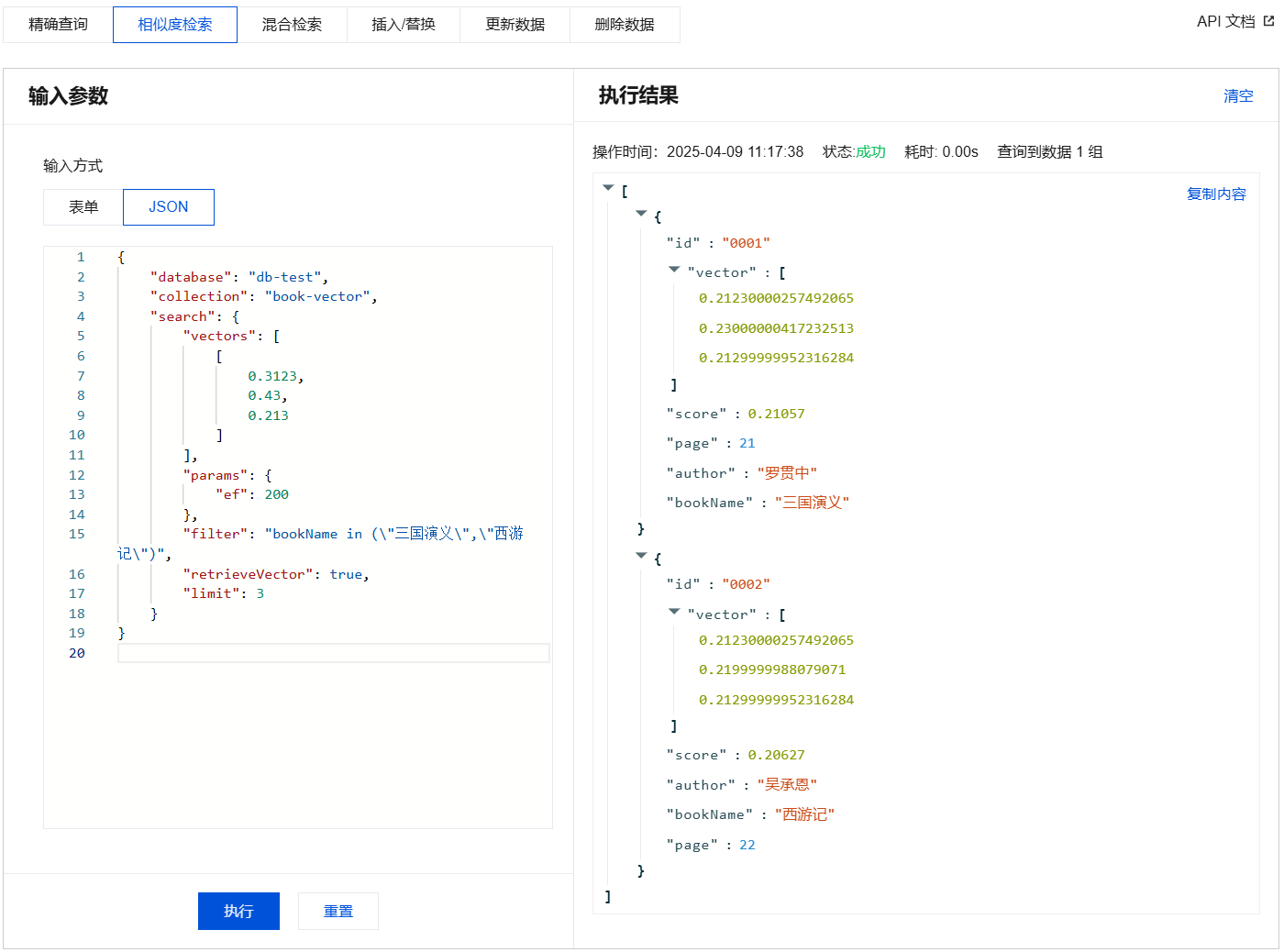 {"database": "db-test","collection": "book-vector","search": {"vectors": [[0.3123,0.43,0.213]],"params": {"ef": 200},"filter": "bookName in (\\"三国演义\\",\\"西游记\\")","retrieveVector": true,"limit": 3}}