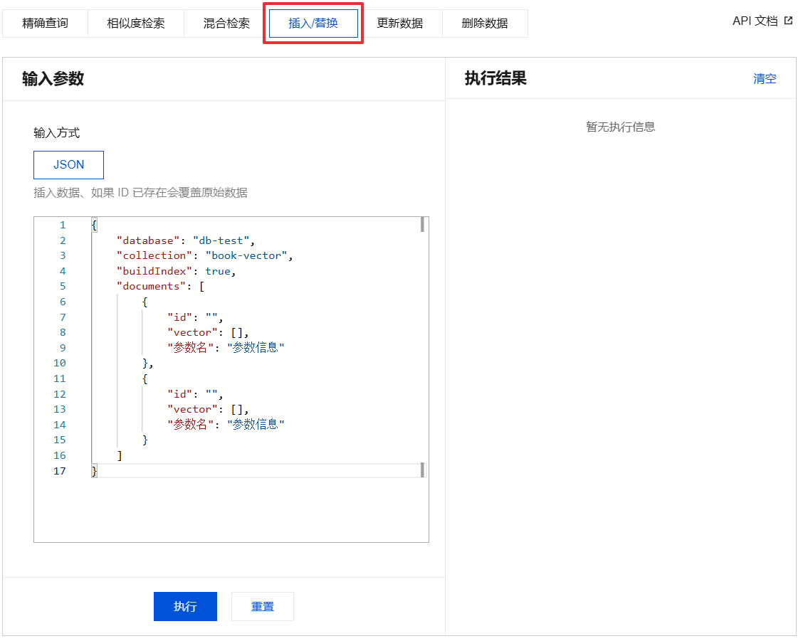 用于给创建集合中插入向量数据。如果创建集合时,已开启 Embedding 并配置参数,则仅需要插入文本信息,Embedding 服务会自动将文本信息转换为向量数据,存入数据库。