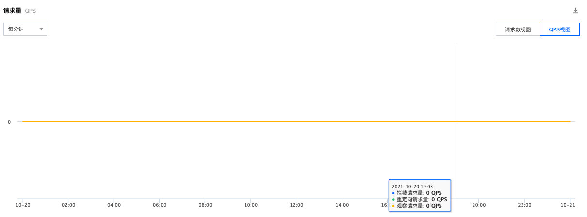 2. QPS 视图:即请求量视图,展示服务器在单位时间内处理的 CC 攻击流量,计算公式为:QPS = 并发量 / 平均响应时间。该视图支持不同时间粒度(每分钟 / 每5分钟 / 每小时)QPS 历史数据查询。