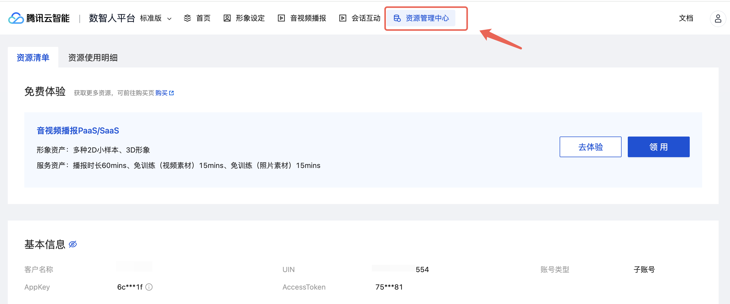 通过平台顶部导航访问“资源管理中心”模块,可以领用试用资源、管理您的形象与服务资产等。