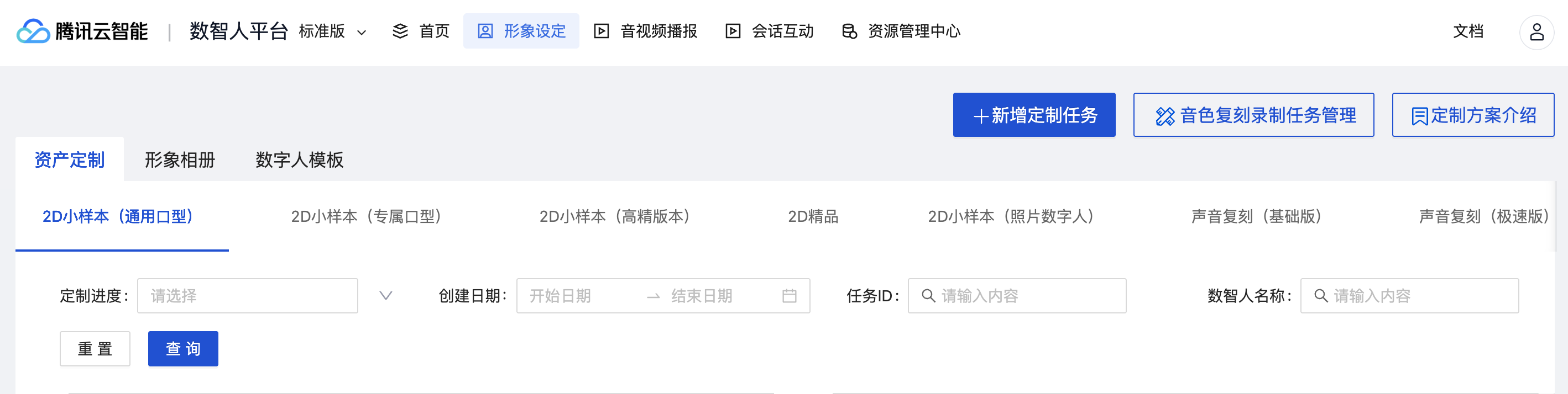 2D真人(2D精品,2D小样本) 3D写实,3D半写实,3D卡通 | 标准形象:适用于公共形象租赁服务 定制形象:适用于专属形象定制服务,需要消耗您所购买的定制配额 |