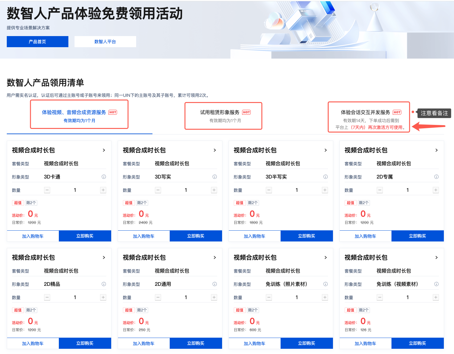 叠加领用:例如【免训练(视频素材)视频合成时长包】,可一次性领用2次(其他资源同理)。