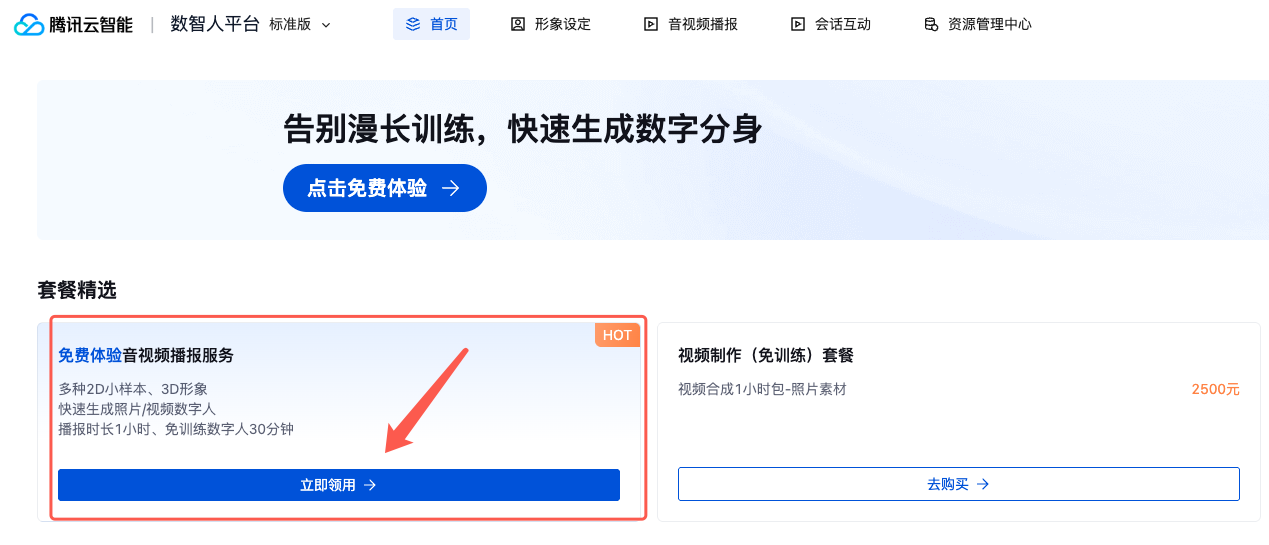 单次领用:若您只想体验2D专属口型播报视频效果,只需领用【2D专属试用租赁形象】和【2D专属视频合成时长包】即可。其他资源可在有新的对应需求时再领用。