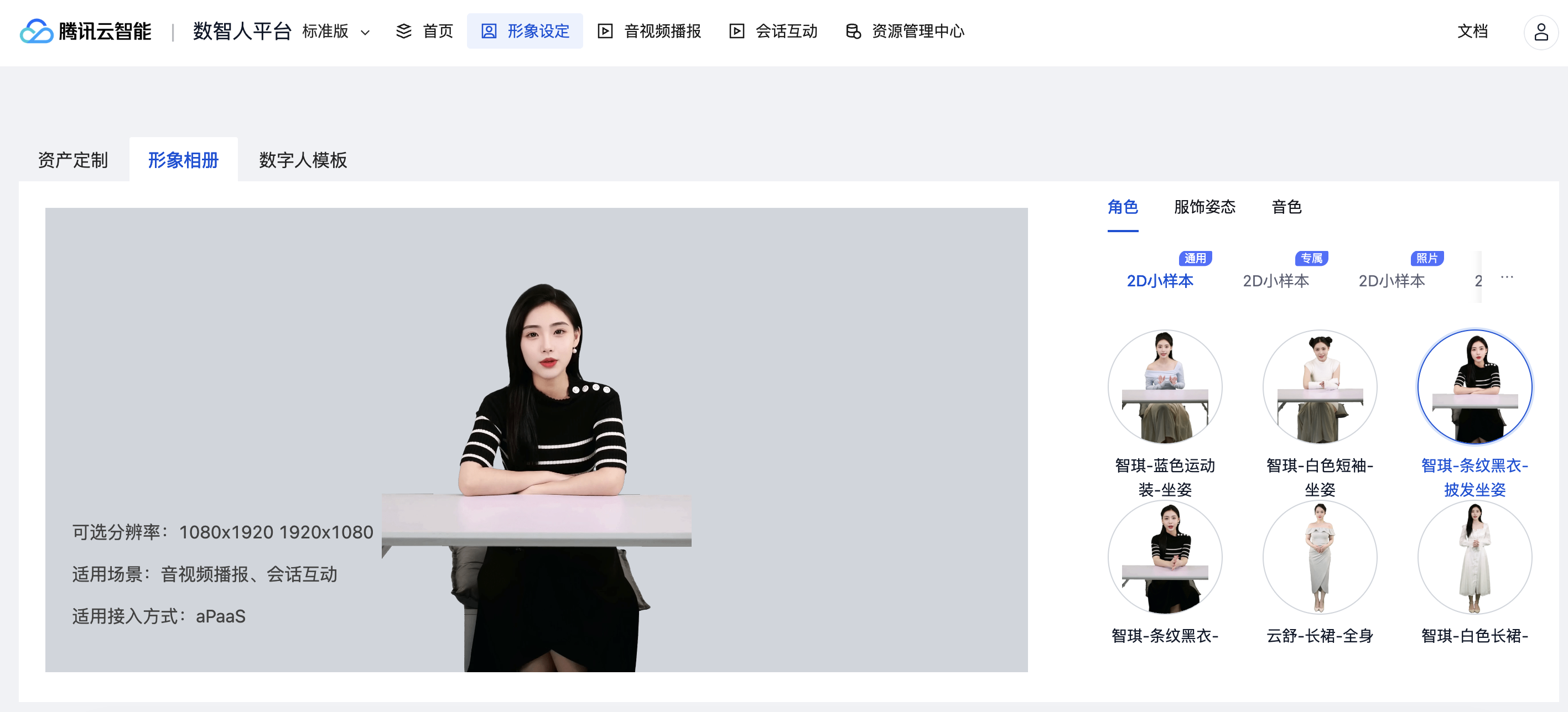 可以在本页面切换查看各形象支持的接入方式、分辨率、适用场景等信息。