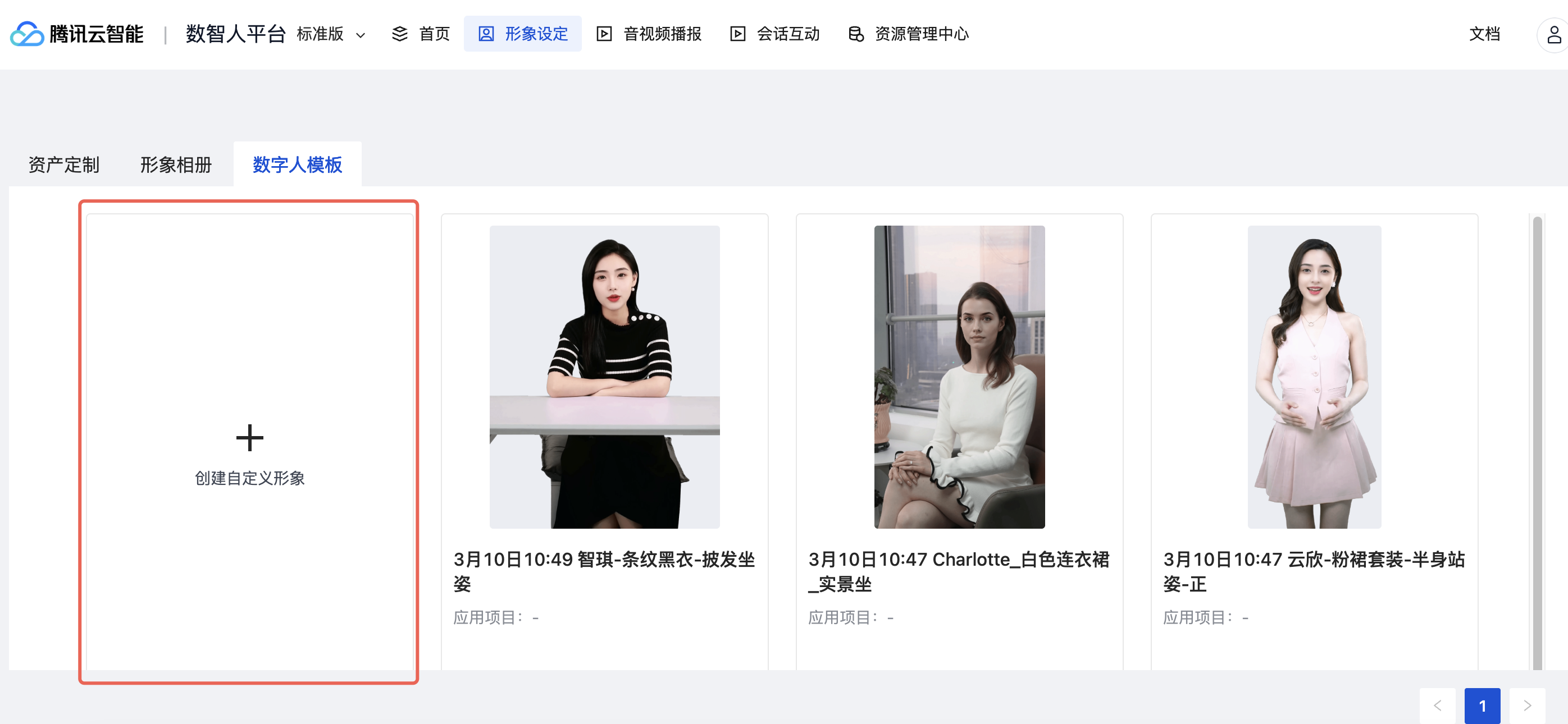 选择已创建的形象模板,点击去应用,选择应用场景,即可快速应用所选数智人形象的配置到指定的新建或已有项目。在后续使用已创建的形象模板时,可在此形象配置基础上进行个性化调整。