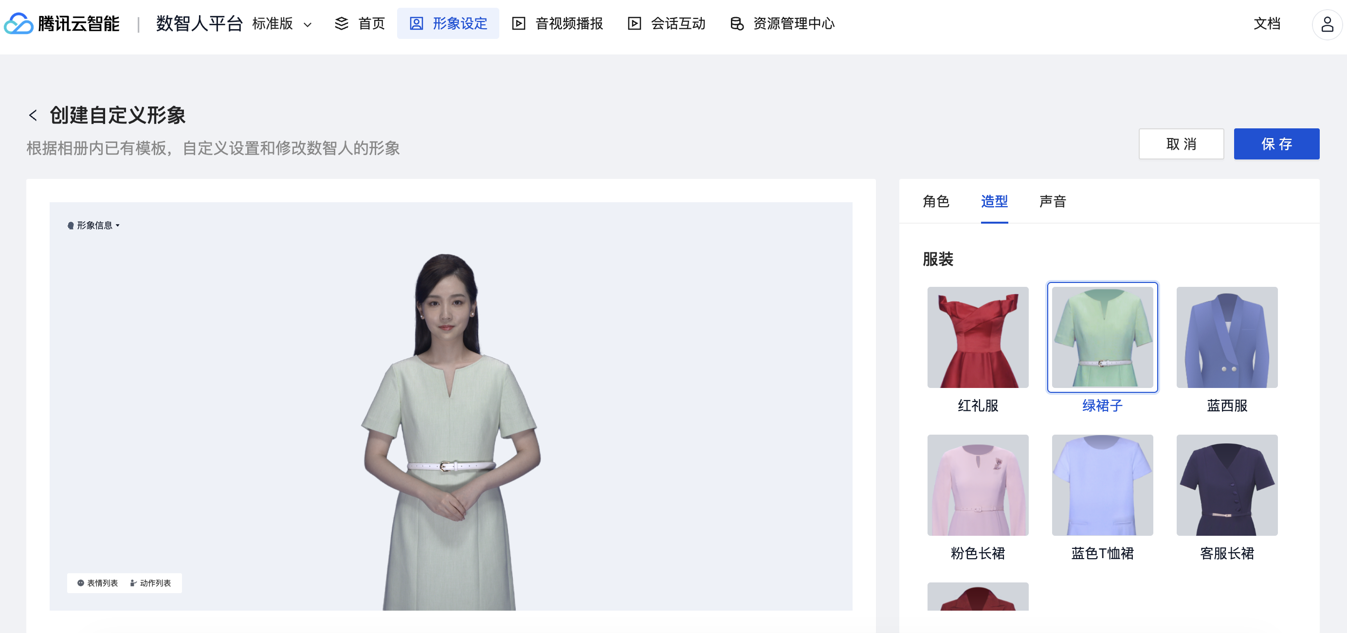 选定数智人的角色后,在这里可以切换该角色可支持的音色、语速,并支持试听;