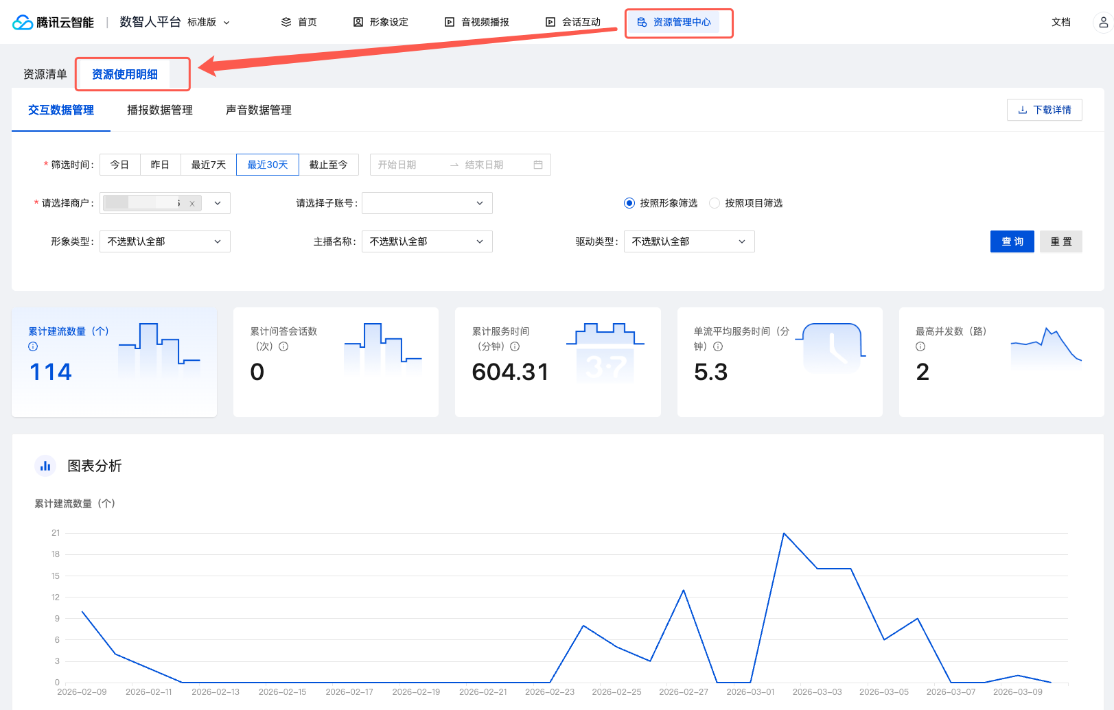 交互数据管理模块支持查看指定时间段、指定商户、指定数智人角色等筛选项下的统计数据,包含:
