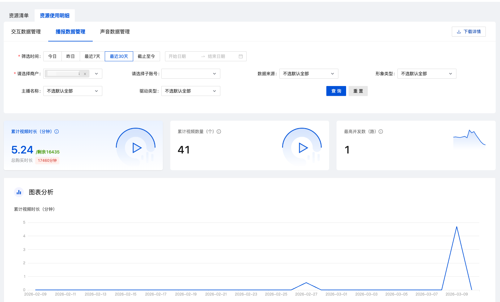 播报数据管理模块支持查看指定时间段、指定商户、指定数智人角色等筛选项下的统计数据,包含: