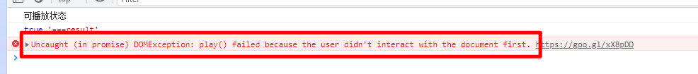 浏览器要在用户的主动行为事件中触发视频播放,如果没有在主动行为里触发会报如下错误。