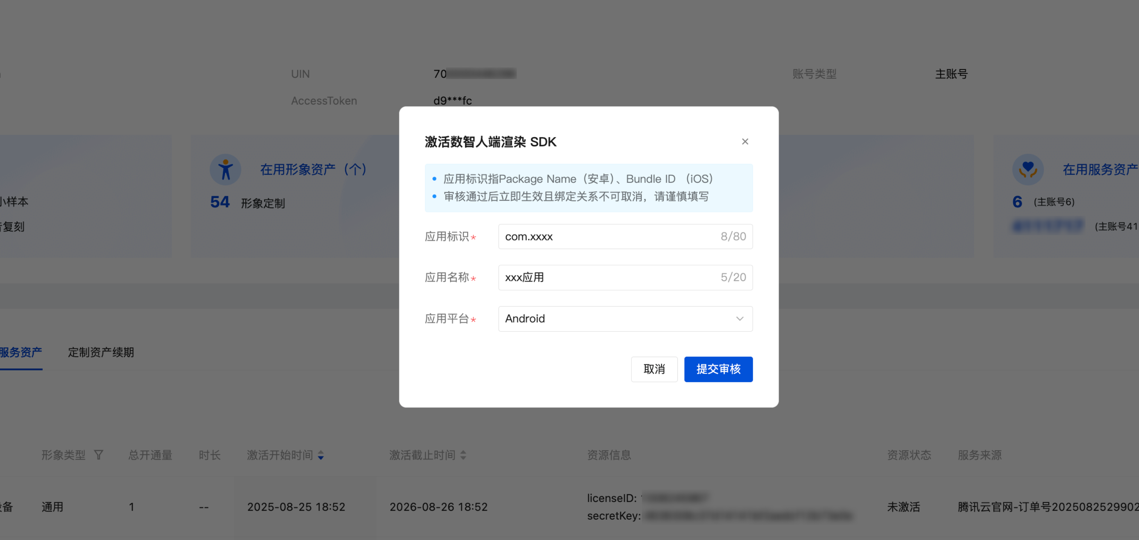 按应用授权时,需要用户自主上传应用信息,审核通过后方可生成 licenseID 和 secretKey。具体流程为:单击去激活 > 填写应用信息 > 提交审核(如下图)。