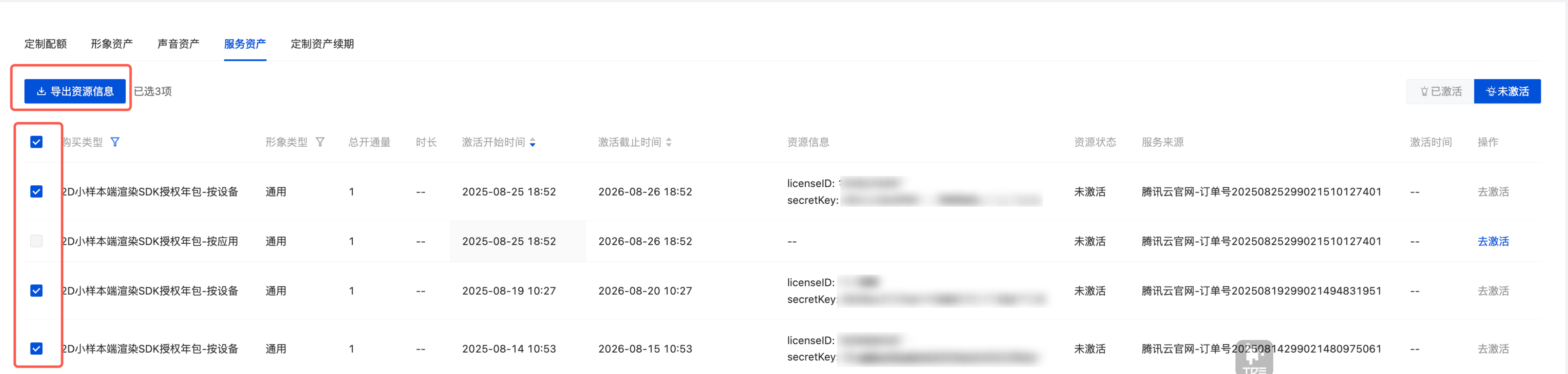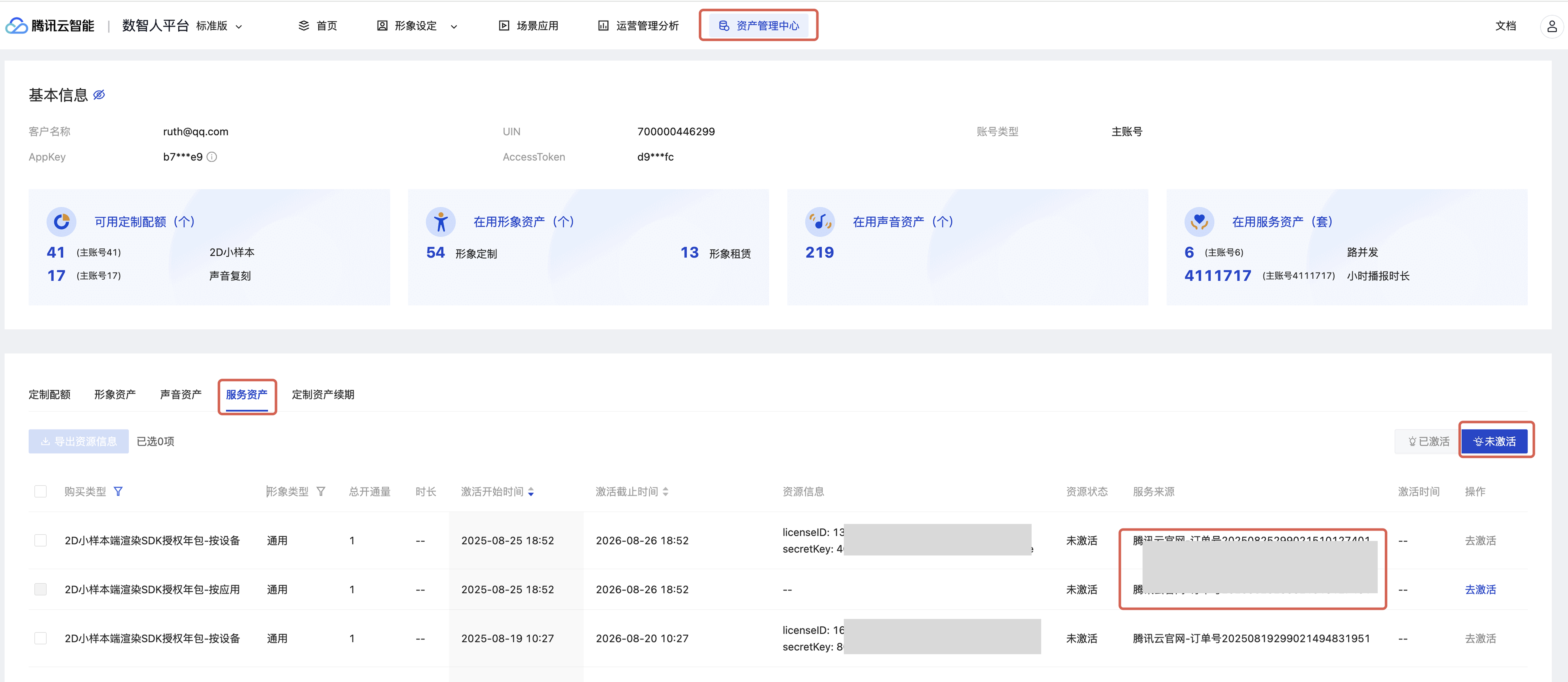 1. 根据“官网下单”指引,完成下单后,登录 数智人平台,按照“资产管理中心 > 服务资产 > 未激活”步骤找到对应的订单信息,如下图:
