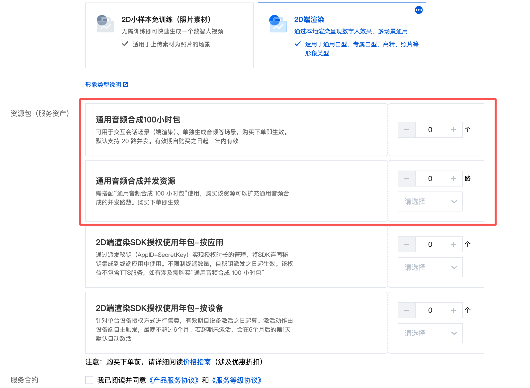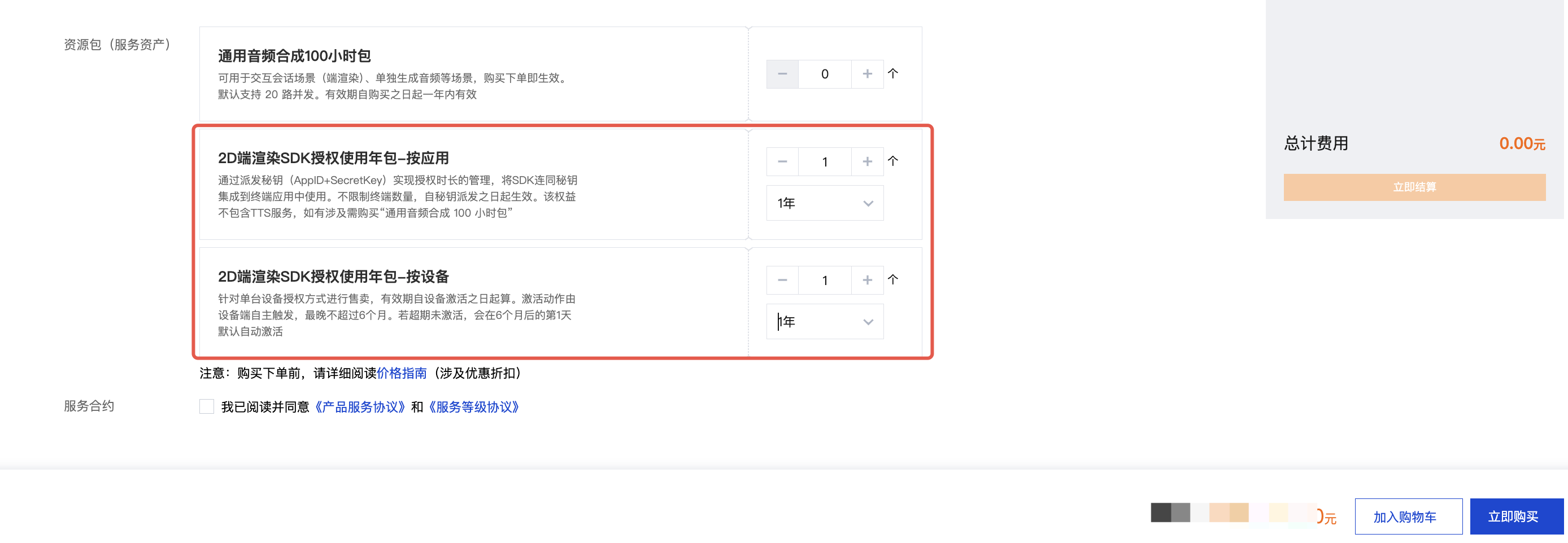2. 找到“2D 端渲染 SDK 授权使用年包”的资源包,选择合适的授权模式后,单击立即购买,如下图所示: