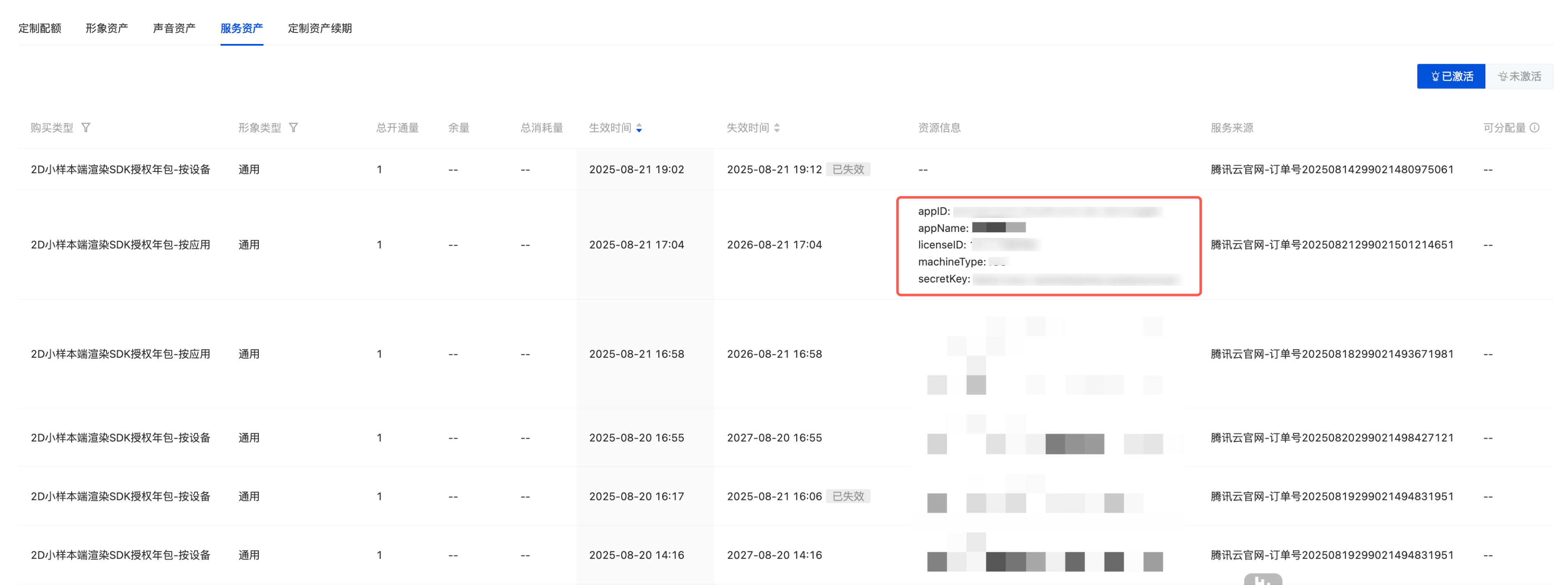 待审核通过后(正常情况下,1个工作日内处理完成),平台会自动生成密钥信息。用户自行复制下载密钥信息。路径为:资产管理中心 > 服务资产 > 已激活。如下图: