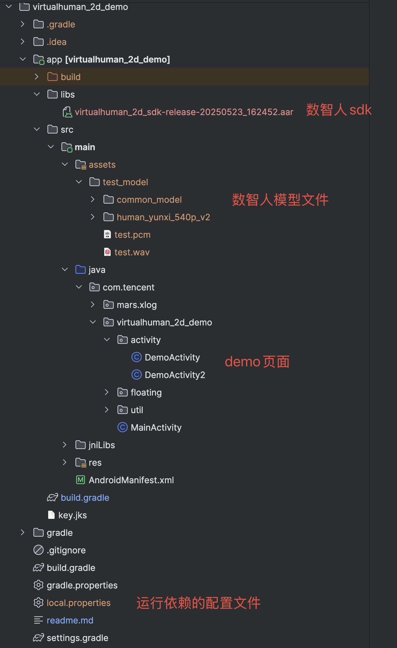VirtualHumanParam vhParam = new VirtualHumanParam();// 本地模型路径vhParam.humanModelPath = "/data/user/0/com.tencent.virtualhuman_2d_demo/files/test_model/human_model";// 本地模型路径vhParam.commonModelPath = "/data/user/0/com.tencent.virtualhuman_2d_demo/files/test_model/common_model";vhParam.appId = "License的appId";vhParam.secretKey = "License的secretKey";vhParam.deviceName = "设备标记,建议用铭牌信息";// 错误回调函数vhParam.errorCallback = (code, message) -> {Log.d(TAG, "Code: " + code + ", Message: " + message);};// 事件回调函数vhParam.eventCallback = (code, message) -> {Log.d(TAG, "Code: " + code + ", Message: " + message);};controller = new VirtualHumanController(this, vhParam);int ret = controller.initHuman();if (ret == 0) {controller.setRenderView(virtualHumanView);// 设置渲染视图controller.startHuman();// 开始渲染} else {Log.i(TAG, "init fail=" + ret);}
