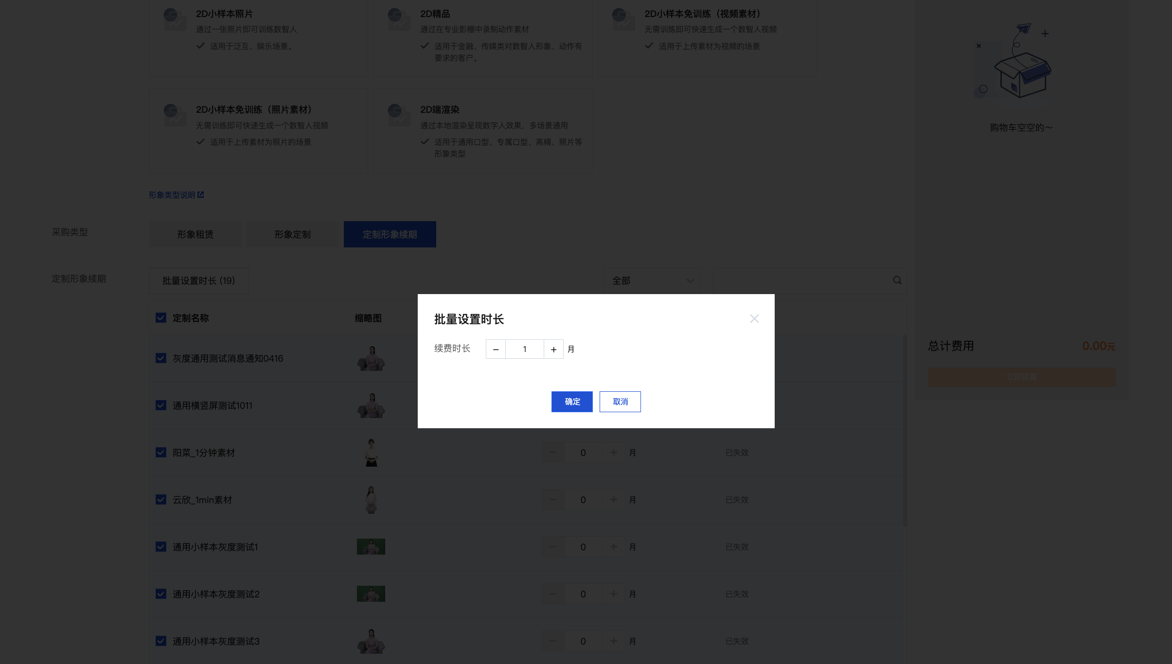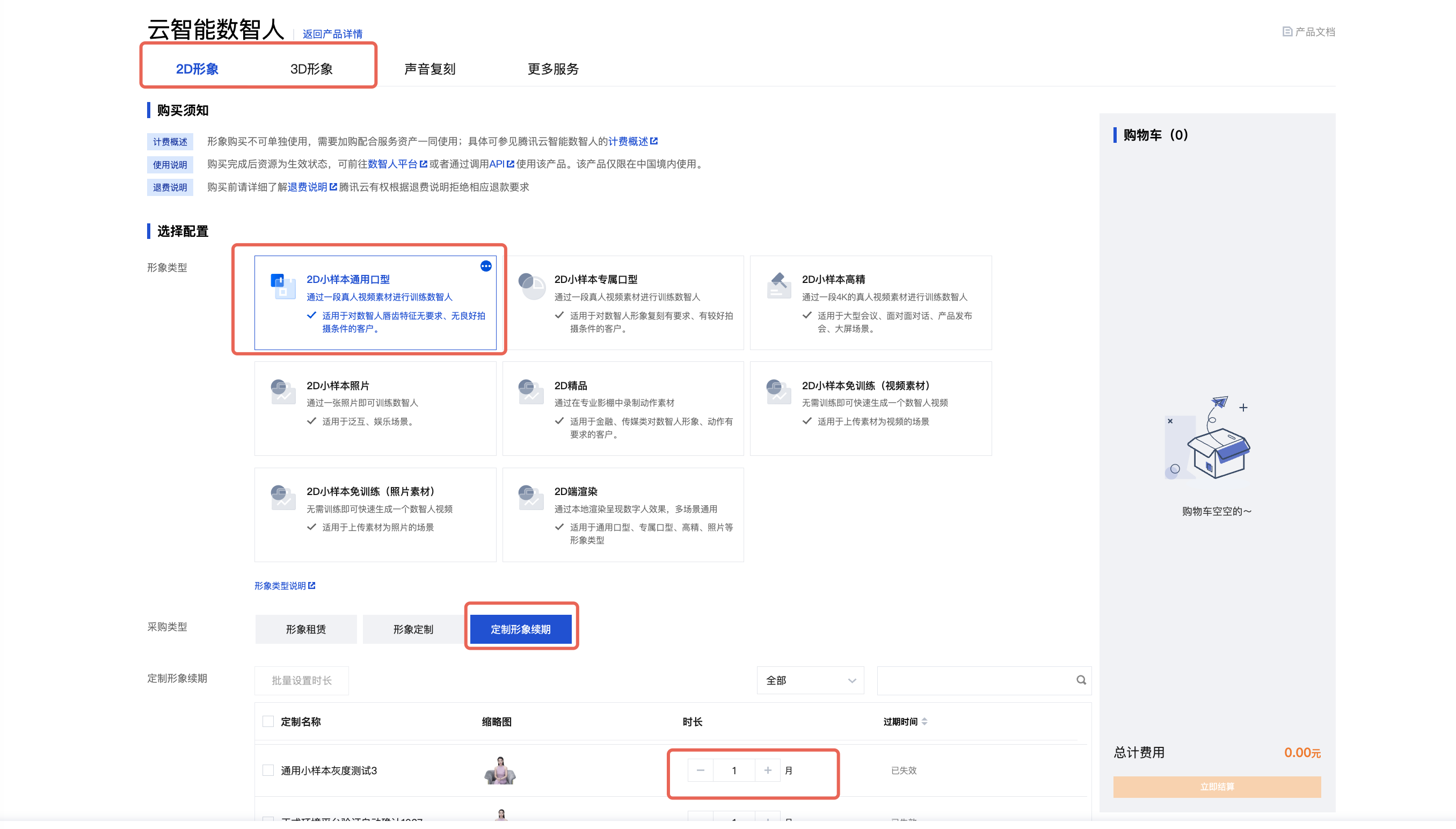 选择“2D”或“3D”模块,确定形象类型,采购类型选择“定制形象续期” ,根据业务需要选择对应的时长和数量。