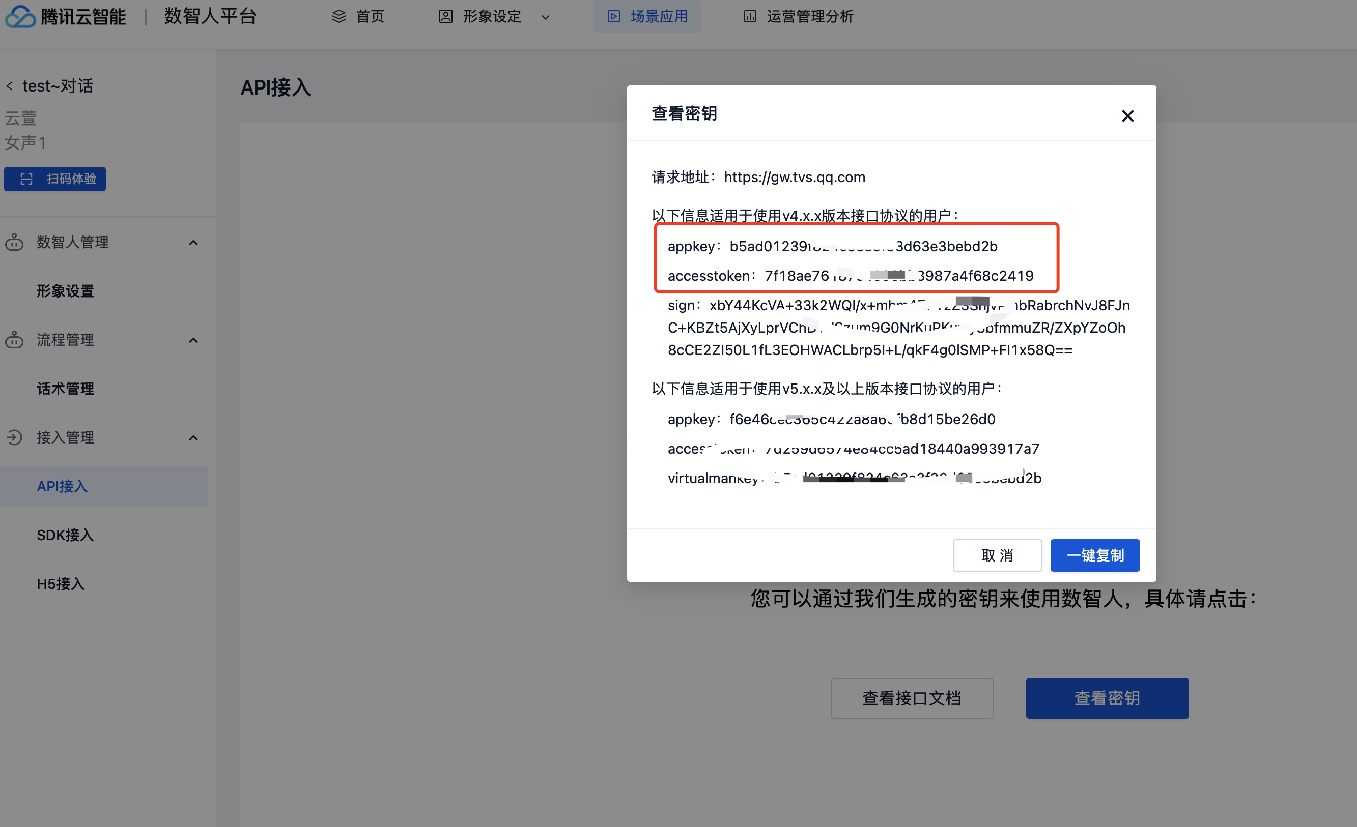 调用交互数智人apass接口必须要携带该数智人项目对应的 appkey 和 accesstoken,具体获取方式是配置平台中以下界面获取: