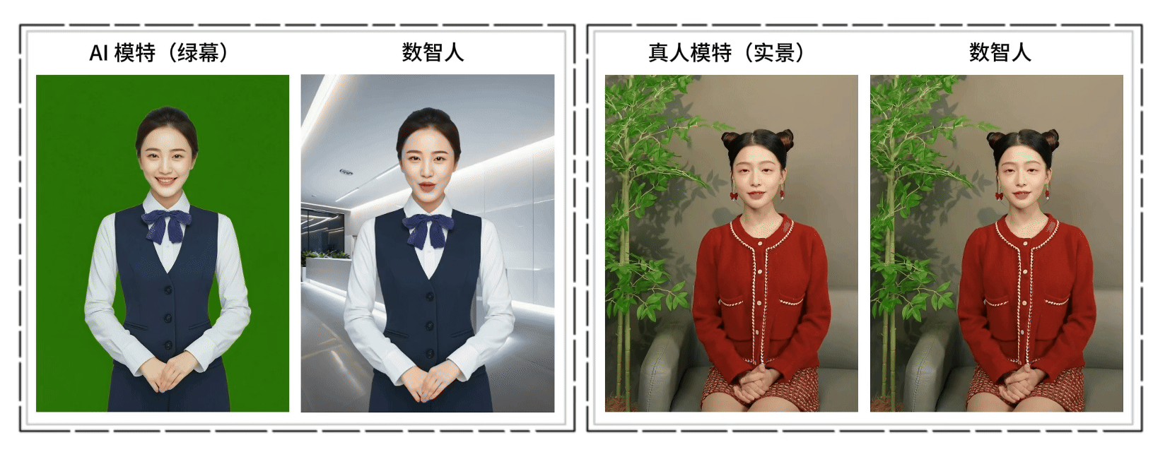 只需提供一张照片或一段 5s 以上视频,即可快速定制与真人高度相似的数智人分身,五官、动作、表情完全模仿真人。支持真人或 AI 模特两种方案,您只需输入文本或语音,即可快速生成专业数智人播报视频。