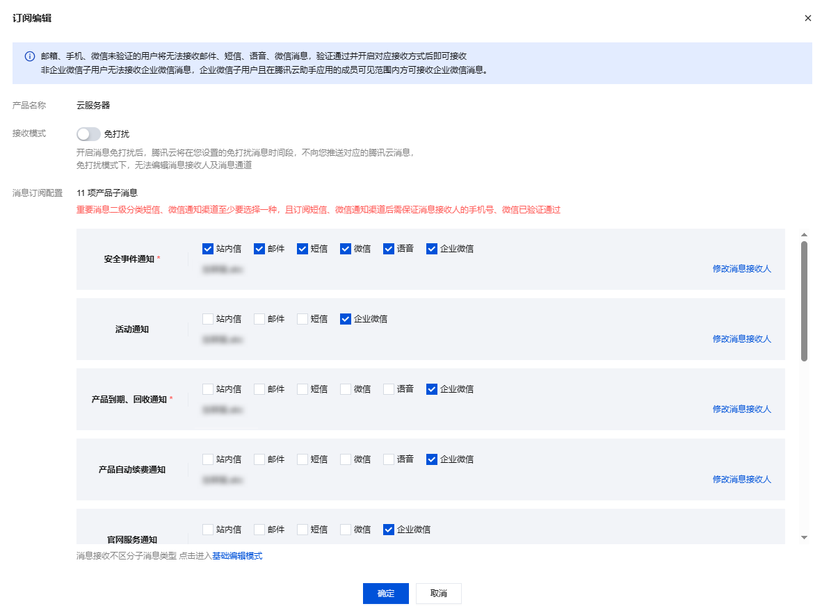 3. 在订阅编辑页面(高级编辑模式),选择您想接收的产品子消息,单击修改消息接收人,可在该产品子消息下配置添加一个机器人。