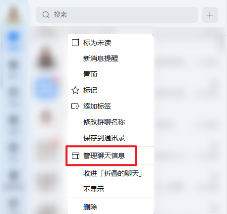 1. 企业微信 PC 端,找到需要接收消息的企业微信群,右键单击管理聊天信息。