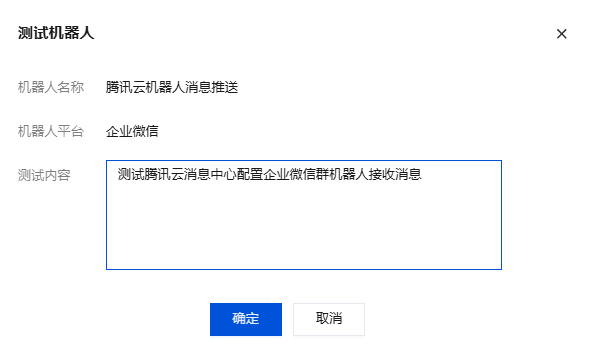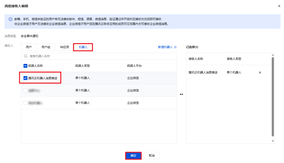 4. 在消息接收人编辑页面,单击机器人,勾选您配置好的机器人,单击确定即可配置成功。