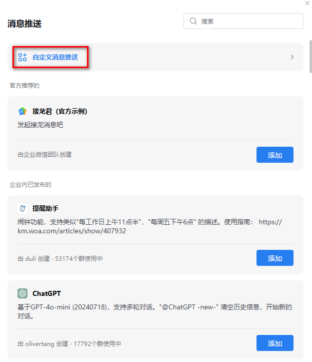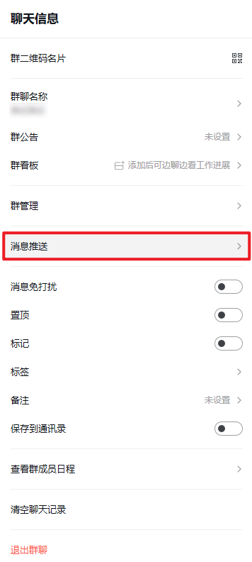 2. 在企业微信客户端右侧弹出的窗口中,单击消息推送。