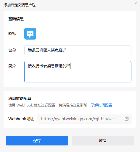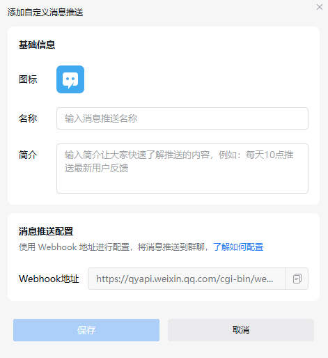 5. 上传图标头像并填写机器人名称以及简介后,复制 Webhook 地址,单击保存添加机器人。